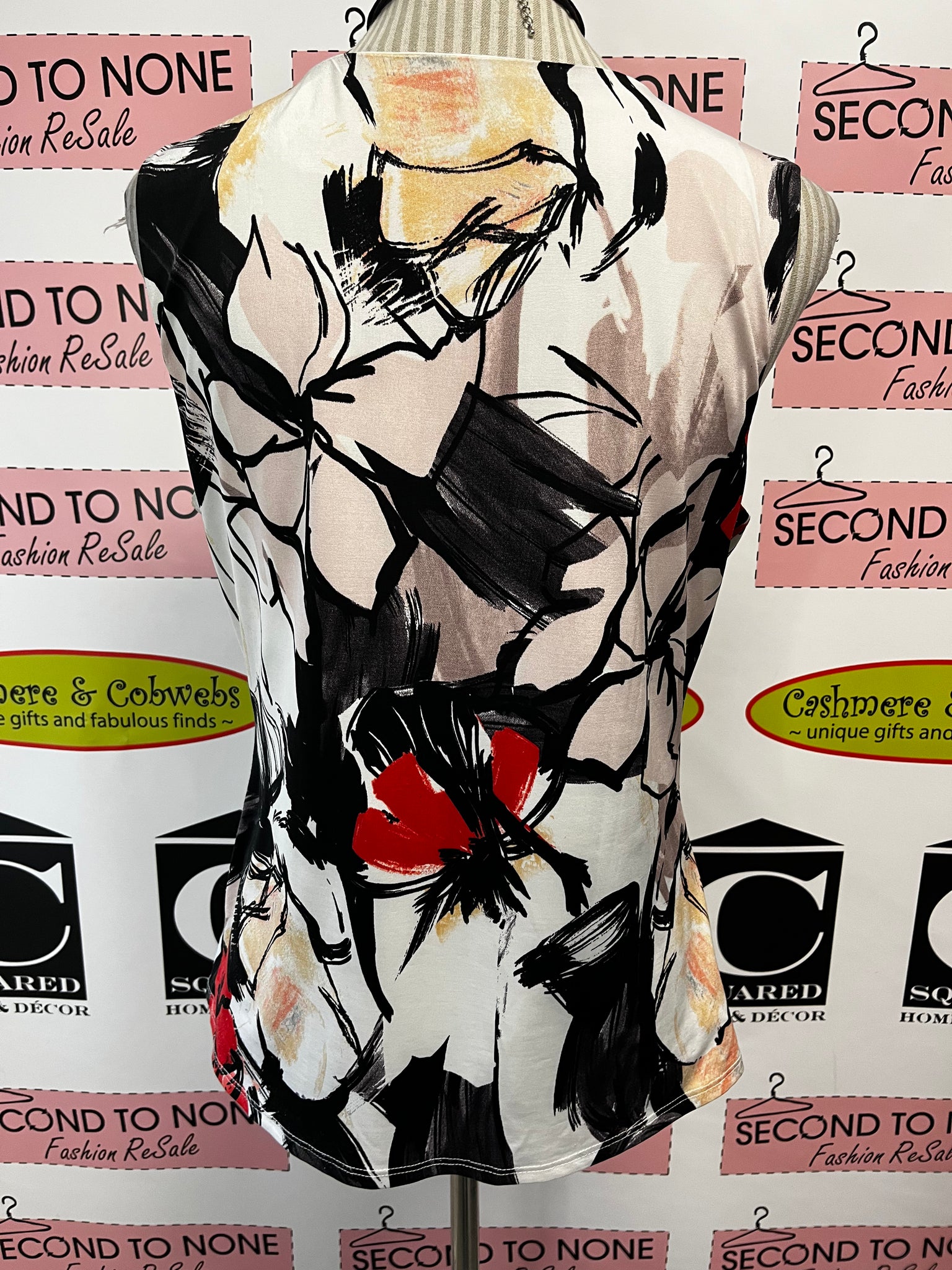 Introducing the Melanie Lyne Sleeveless Blouse, a masterpiece of fabric and design. Adorned with an abstract floral print in vibrant shades of pink, red, and orange, this exquisite piece, set against a classic black and white canvas, evokes an artistic sensibility. Its thick, smooth material offers an elegant drape that gracefully conceals, while the scoop neck and center pleating add a touch of sophisticated allure. Effortlessly partnered with tailored black or white trousers, this blouse is a harmonious blend of boldness and refinement, perfect for the discerning wearer. Size M.