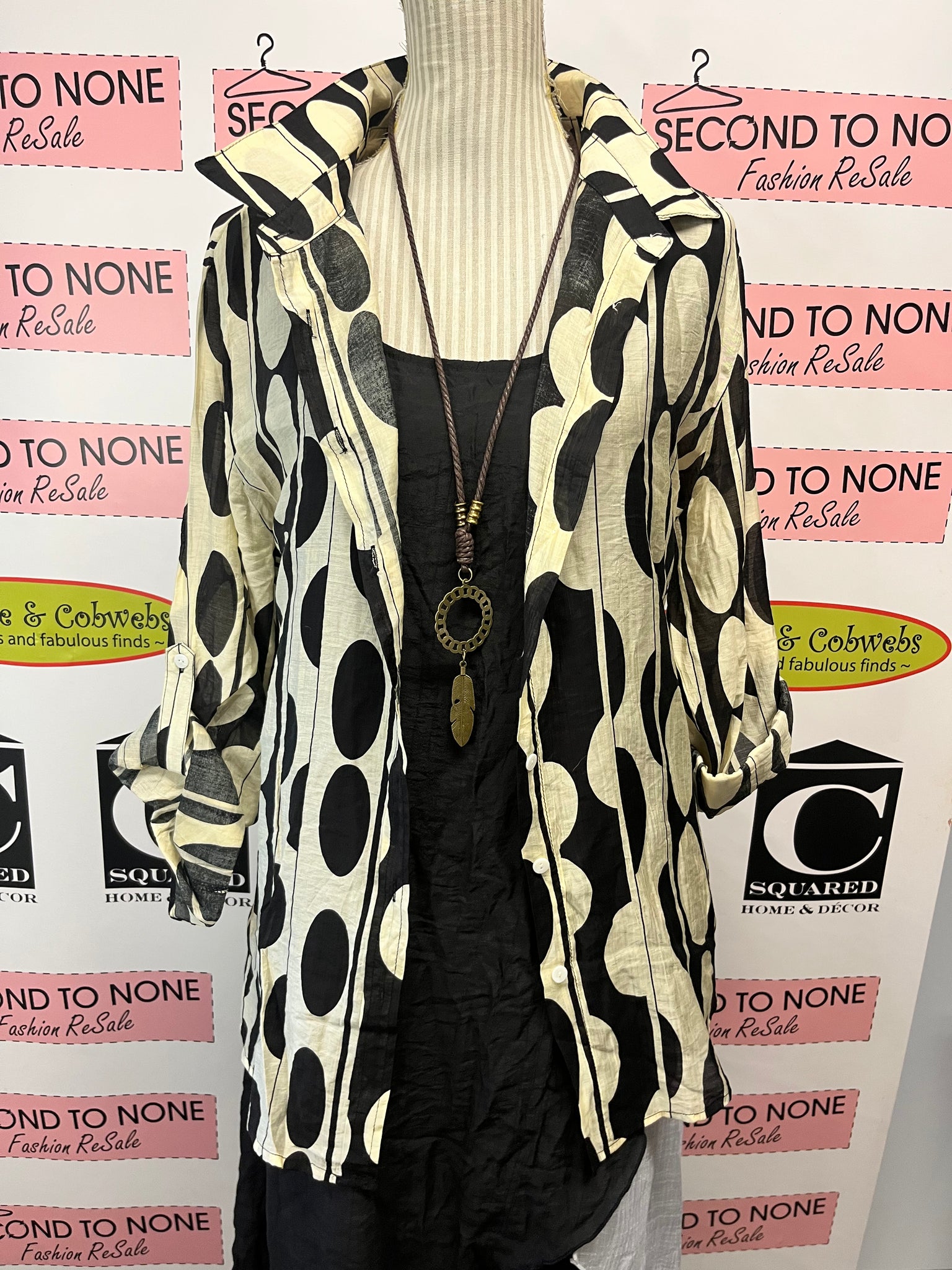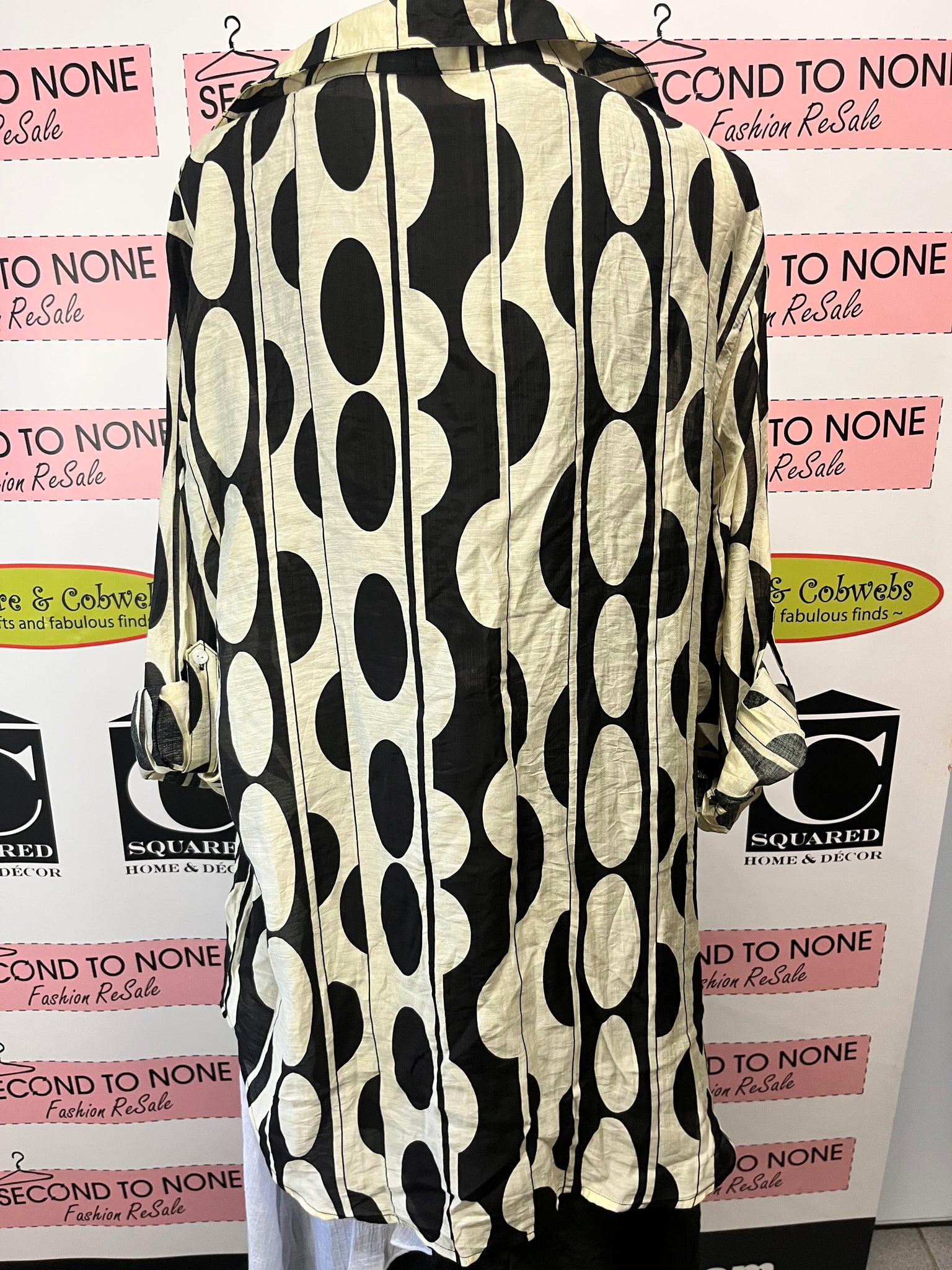 The NWT Sheer Printed Button Down is perfect for packing and travelling, with its super lightweight fabric and ability to fold down into nothing. The black and cream stripes and circular print add a fun and unique touch to this versatile piece, making it the perfect addition to any closet. Its longer hemline allows for wearability with a variety of bottoms, wear it buttoned up or open- this piece can truly do it all! Brand new with tags attached. Size 2XL.