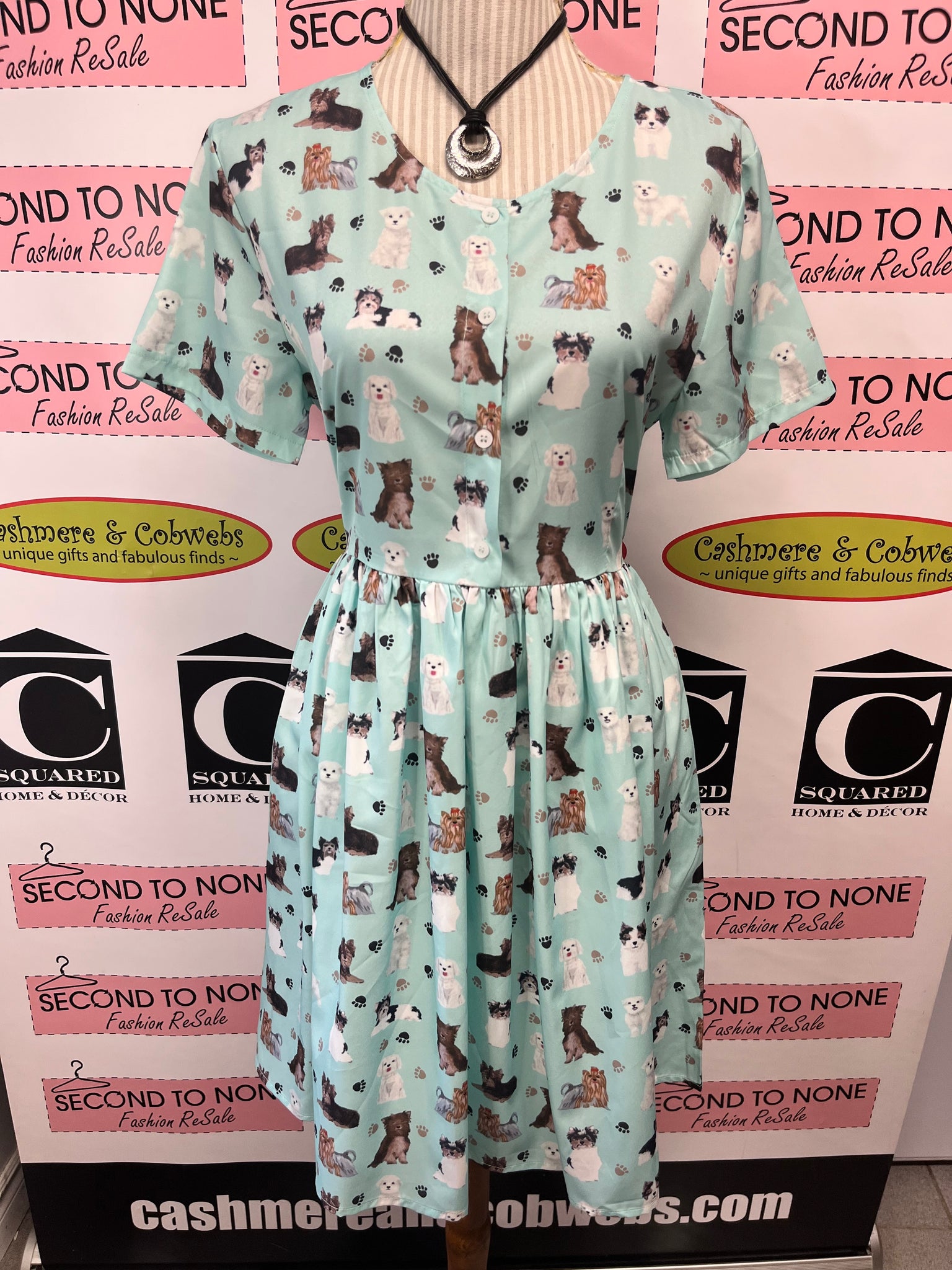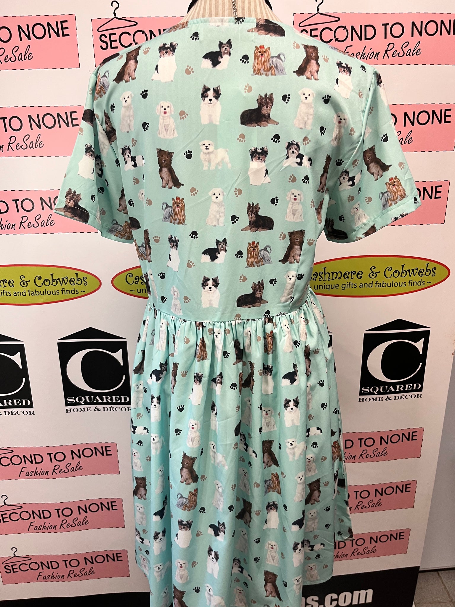 This playful dog print dress in a charming teal hue features an assortment of adorable pups on both front and back. Designed with a button-front top and gathered hem, it offers a flattering fit and breezy comfort. Lightweight short sleeves keep it perfect for sunny days, making it a fun statement piece for any dog lover who wants to showcase their passion with style.  SM Wardrobe brand.  100% polyester.  (original price says $60)