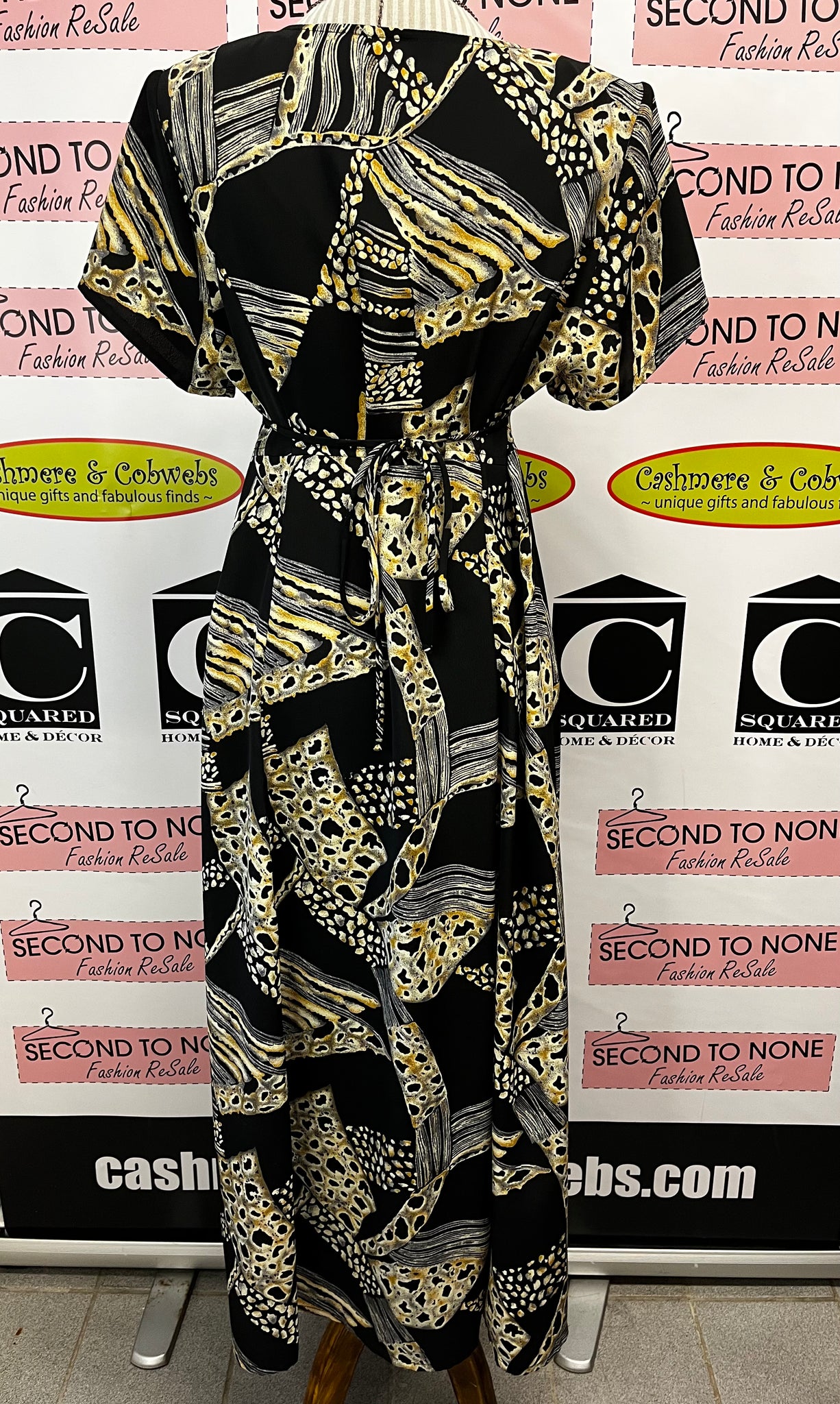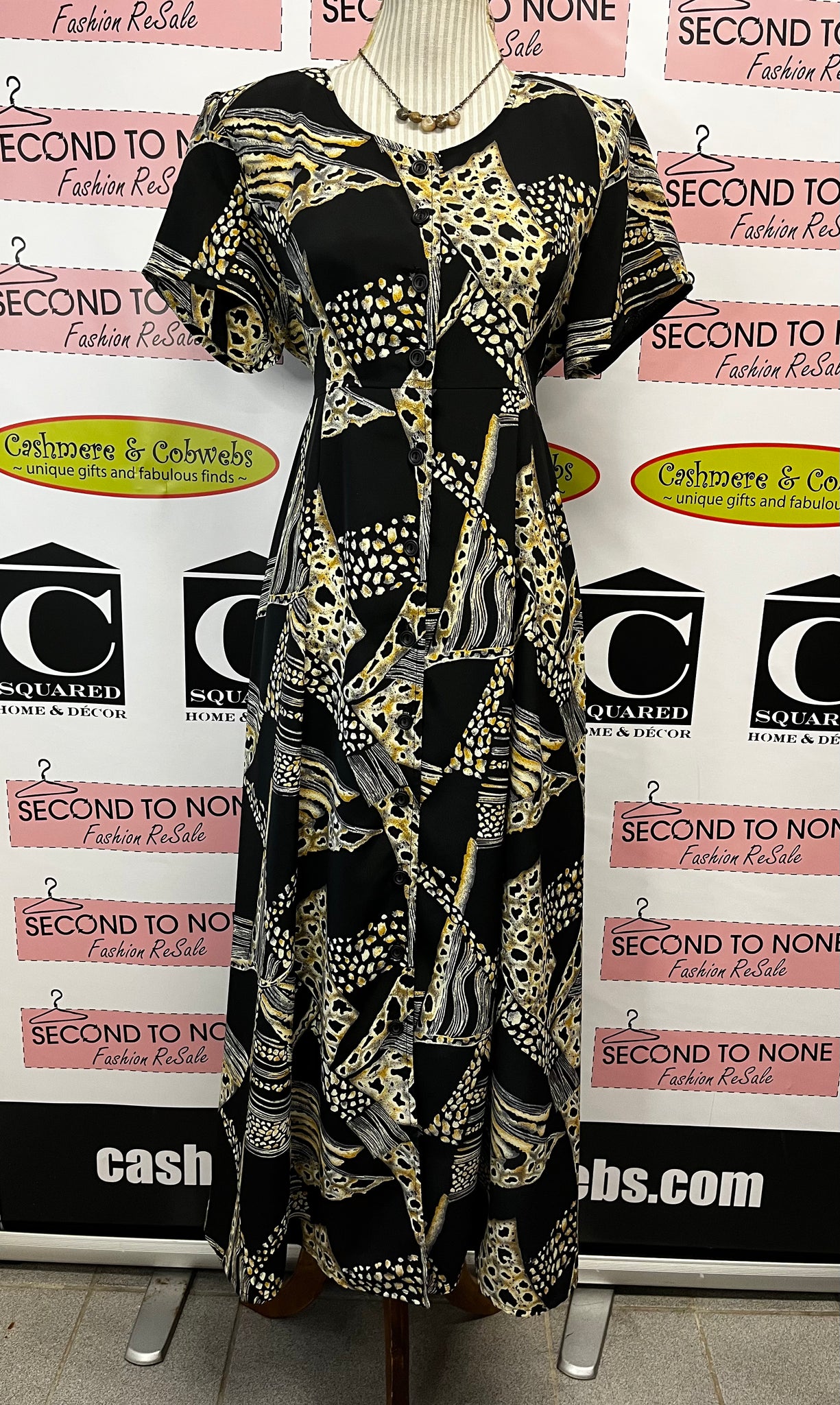 Exude a sophisticated and unique style with our Vintage Button-Down Dress (Size 8). Designed with an abstract bones-like print in yellow, cream, and grey, this dress is a work of art. The shoulder pads and string tie-back cinch your waist for a ultra flattering silhouette. Made in Canada, this lightweight dress folds down small, making it a perfect travel companion. Let the dress do the talking and pair it with classic black heels for an elegant look. Brand: Zacks. Size 8.