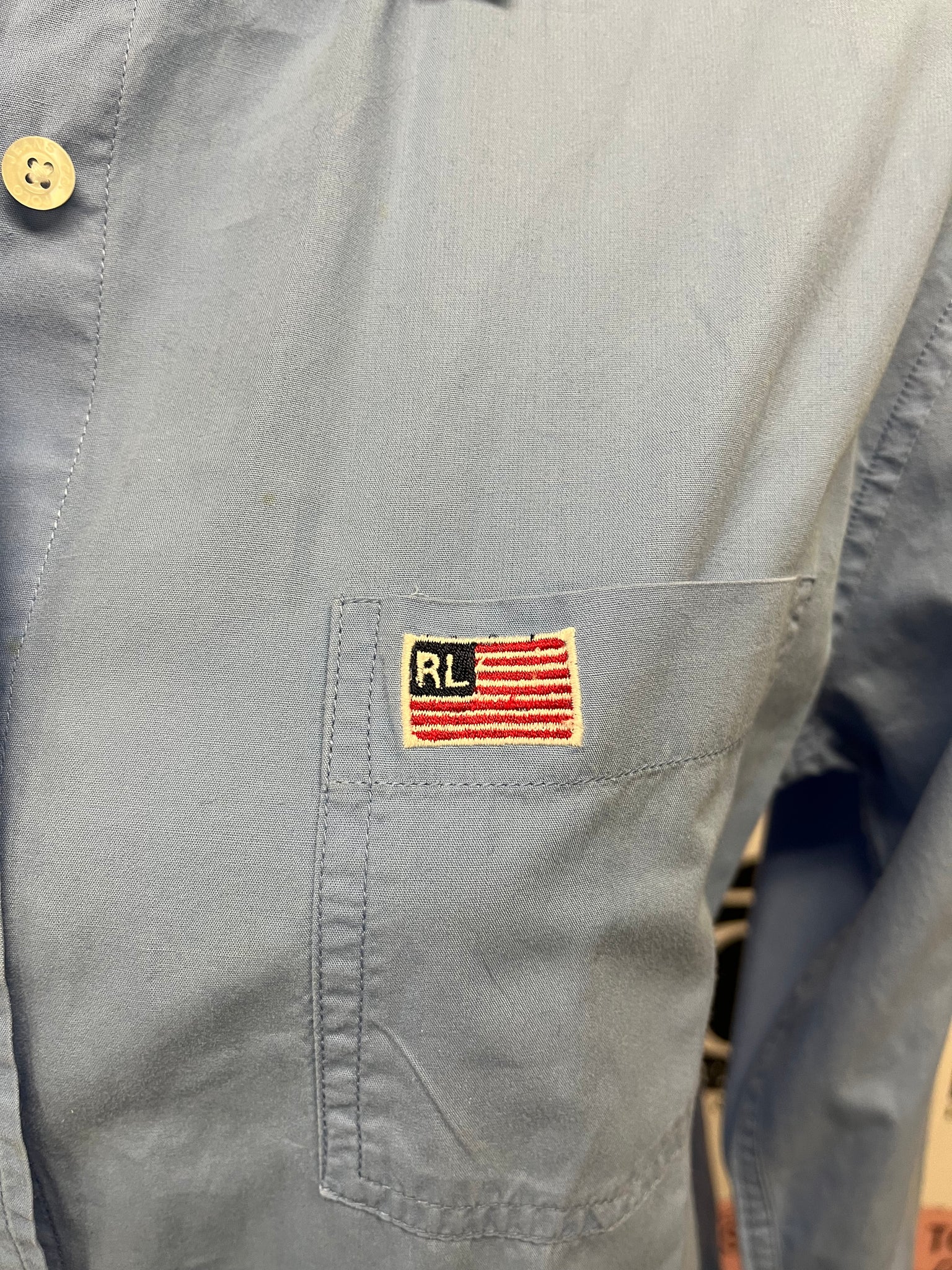 This Vintage Polo Ralph Lauren Cotton Shirt is a classic, preppy wardrobe staple. Made with 100% soft cotton, it features the iconic "RL" American flag patch embroidered on the front pocket. The branded off-white buttons add the little details that make this timeless piece as cool as it is. Size M.