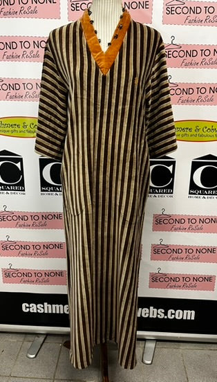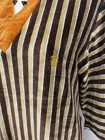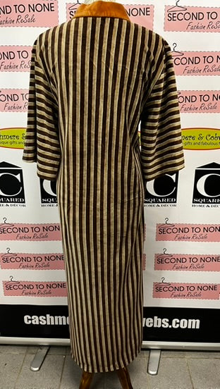 Step into a world of luxurious comfort with our Vintage Striped Robe/Dress. Made with soft velour fabric and featuring a kaftan-style design, this unique piece is perfect for lovers of 1970s glam. The chocolate brown, tan, cream, and burnt orange striping and subtle embroidered emblem add playful elegance. With 2 pockets and a deep v neckline, this mid-length sleeve robe/dress offers both style and convenience. Wear it as a luxe house robe or style it with boots and a long coat for a bold retro look. Soft, plush texture and a flowing drape make this piece a must-have. Brand: Majestic. Size S.