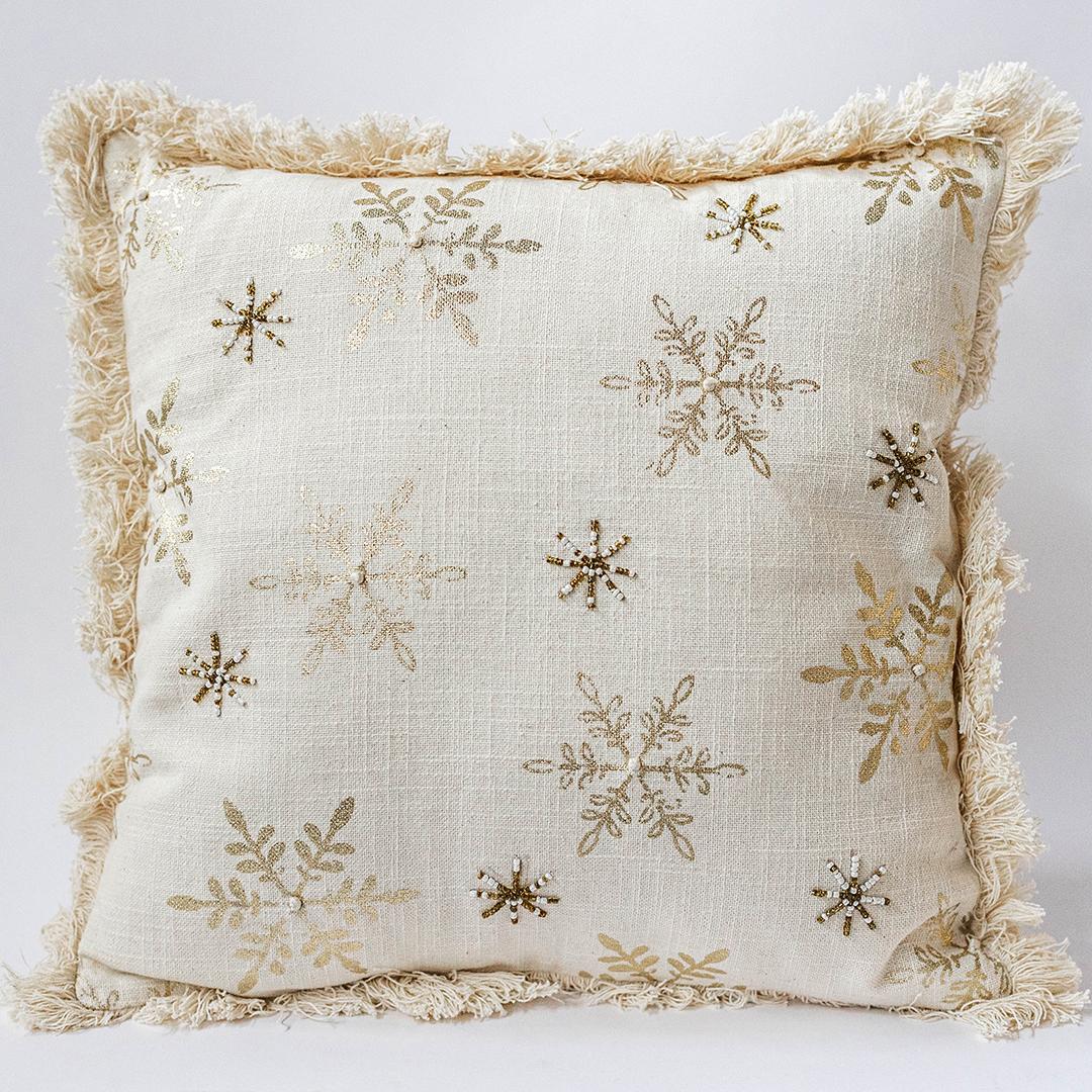 – cream and gold colours– cotton fabric with fringe– foil printed snowflakes and beads on the front– zipper closure