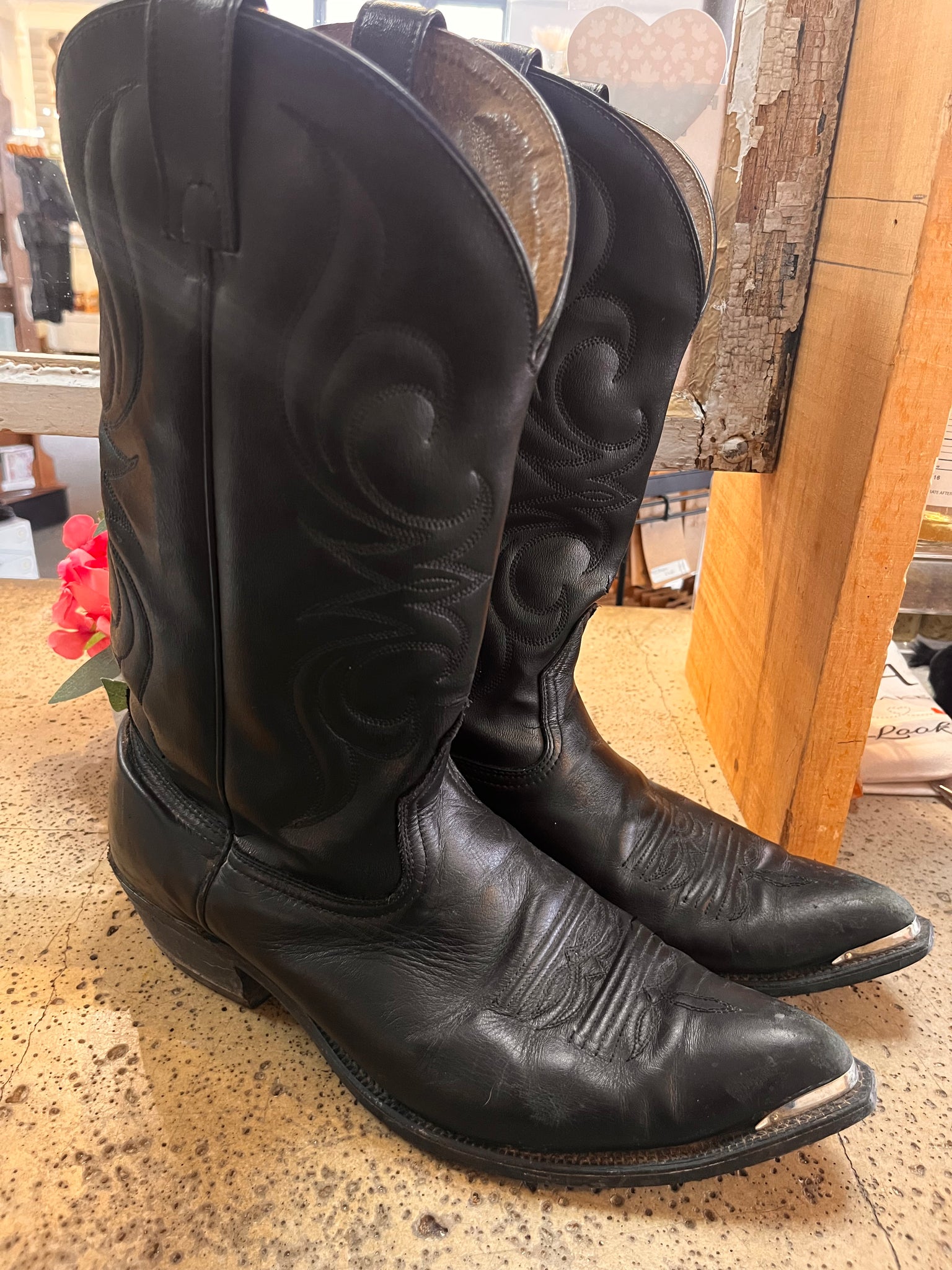 These custom-made cowboy boots deliver authentic Western style with serious craftsmanship. Handstitched details on the toe and calf showcase traditional bootmaking, while the reinforced metal toe protector adds durability for real wear. A full leather sole grounds every step in quality. Found in excellent condition, these boots are ready to break in and become a wardrobe staple for anyone serious about their Western aesthetic.