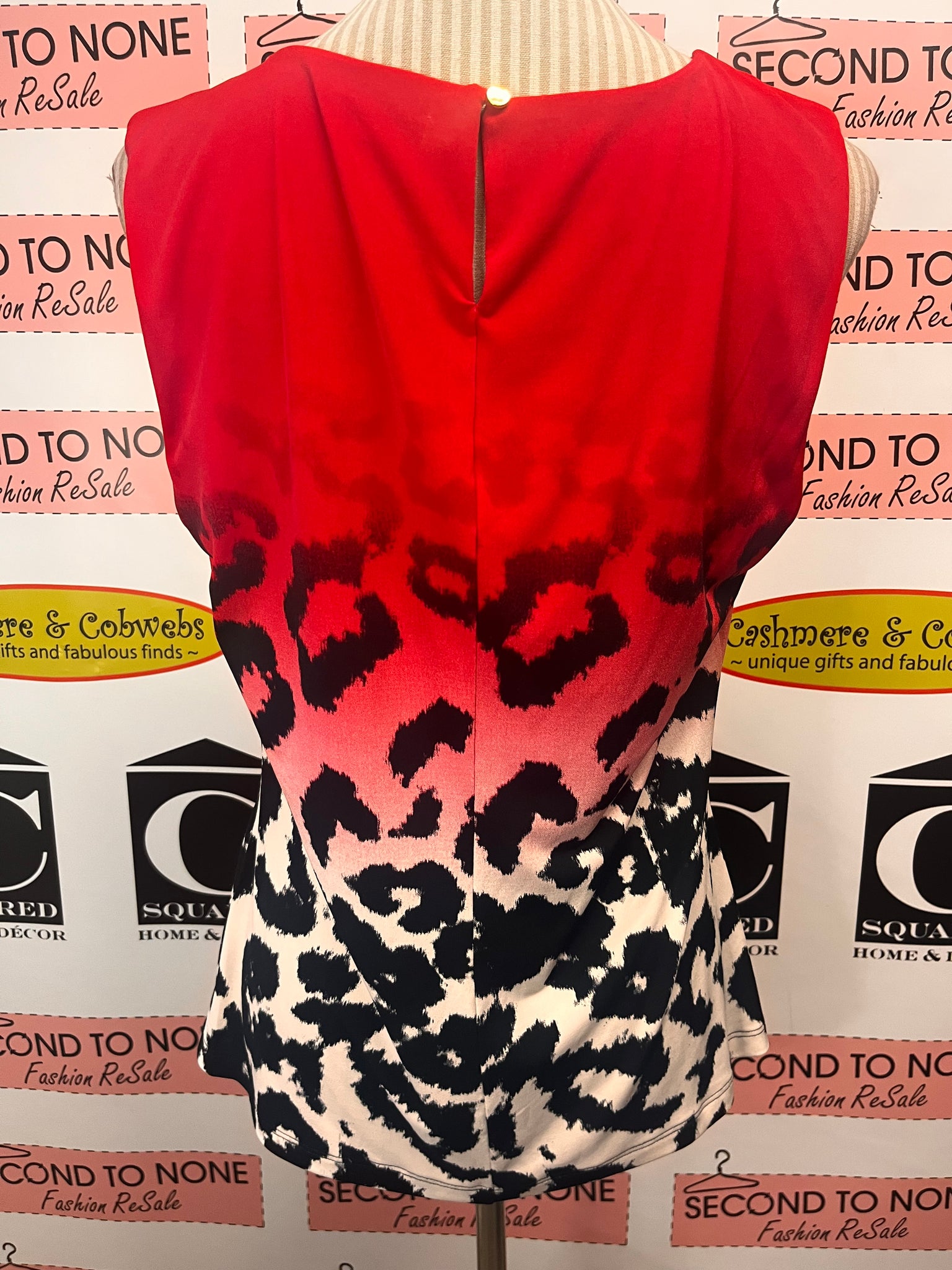 A refined sleeveless top that balances edge with elegance. Crafted from stretchy, smooth fabric, it features a striking ombre design transitioning from rich red to crisp white, accented with black animal print. The round neckline is enhanced by subtle pleated detailing, while a sophisticated keyhole cutout at the upper back adds an unexpected touch of allure. Designed for the modern woman who appreciates a bold touch. No size tag, fits L.