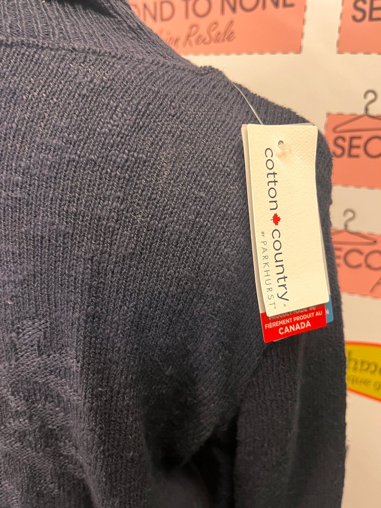 Wrap yourself in Canadian-made comfort with this navy turtleneck that's ready to become your go-to layering essential. The oversized snowflake motif adds a touch of winter charm, while the lightweight 100% cotton construction keeps things breathable and cozy. Roll-hem details at the cuffs and bottom give it an effortlessly polished look. Brand new with tags, this is the perfect piece to layer under jackets or wear solo when the temperature calls for something soft and snug. Size M. Brand: Cotton Country.