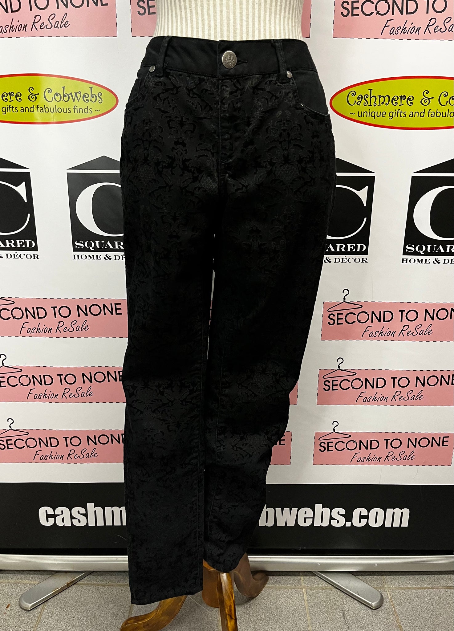 These sleek black jeans feature a luxe velour print that adds unexpected texture and visual interest to your everyday rotation. Crafted from a comfortable cotton blend with just the right amount of stretch, they move with you without losing their shape. The straight-leg silhouette is a timeless choice that pairs effortlessly with everything from sneakers to heels. Nicole Benisti brings her signature style to these versatile pants—a wardrobe essential that feels anything but basic.