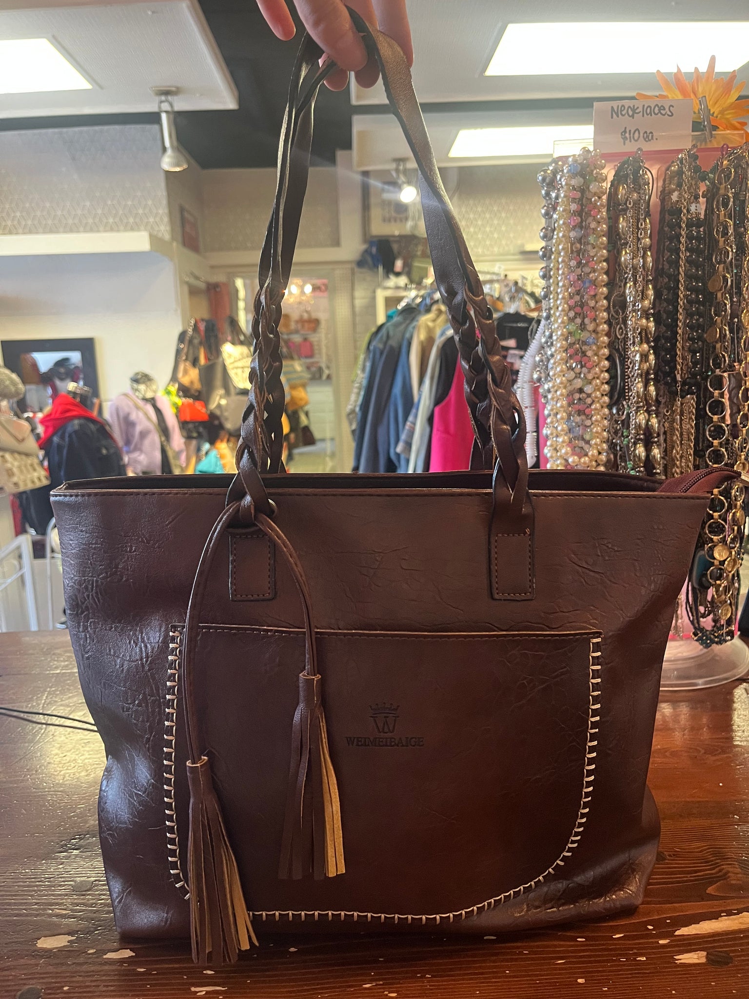 Carry effortless style from the boardroom to the farmer’s market in this oversized mahogany tote. Rich faux leather with a subtle crinkled finish pairs beautifully with cream-stitched detailing and braided shoulder straps for a refined, textured look. The spacious front pouch and zippered interior pocket keep essentials organized, while playful fringe tassels and gold hardware add understated personality. Versatile enough for work, weekend errands, or casual outings—a sophisticated everyday companion.