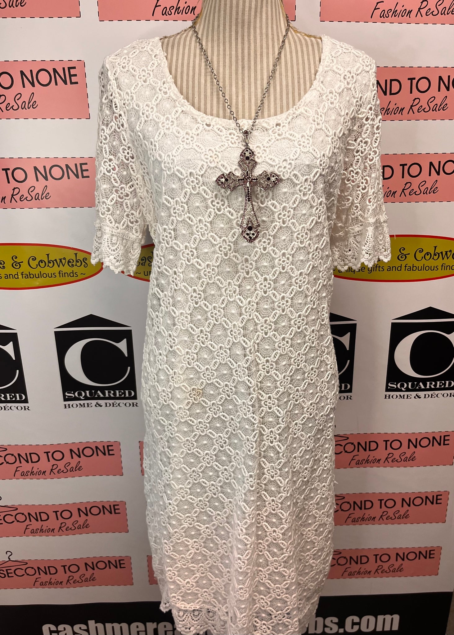 Delicate eyelet lace adorns this refined cotton dress, creating an intricate, airy aesthetic perfect for warm-weather occasions. The scoop neckline and transparent short sleeves offer understated elegance, while the white lining beneath ensures modest coverage without compromising the dress's ethereal appeal. Crafted from 100% cotton, this piece balances feminine sophistication with comfortable wearability—a versatile staple for those who appreciate thoughtful design and quality construction. Size 1XL. Brand: Arvanti.