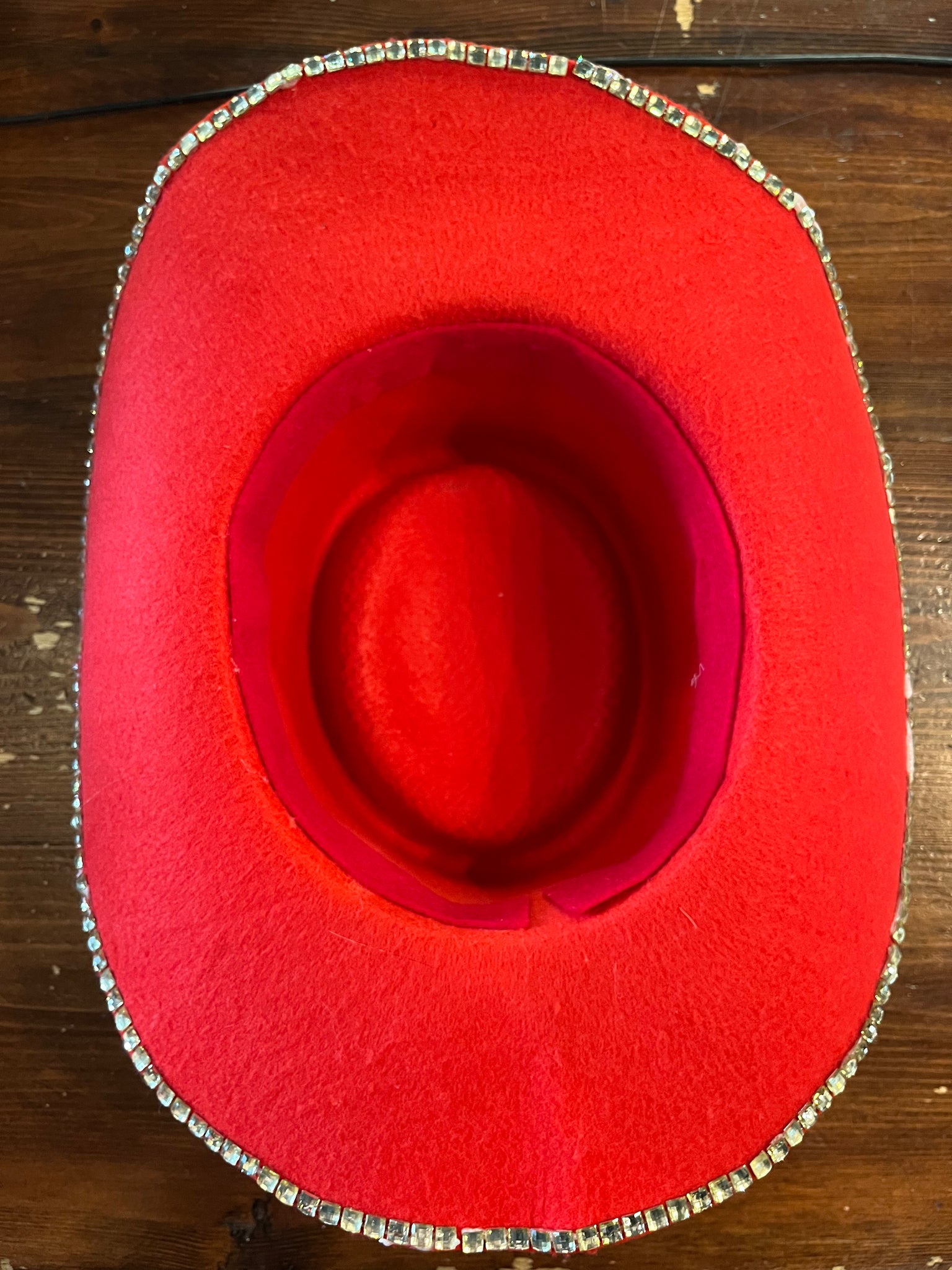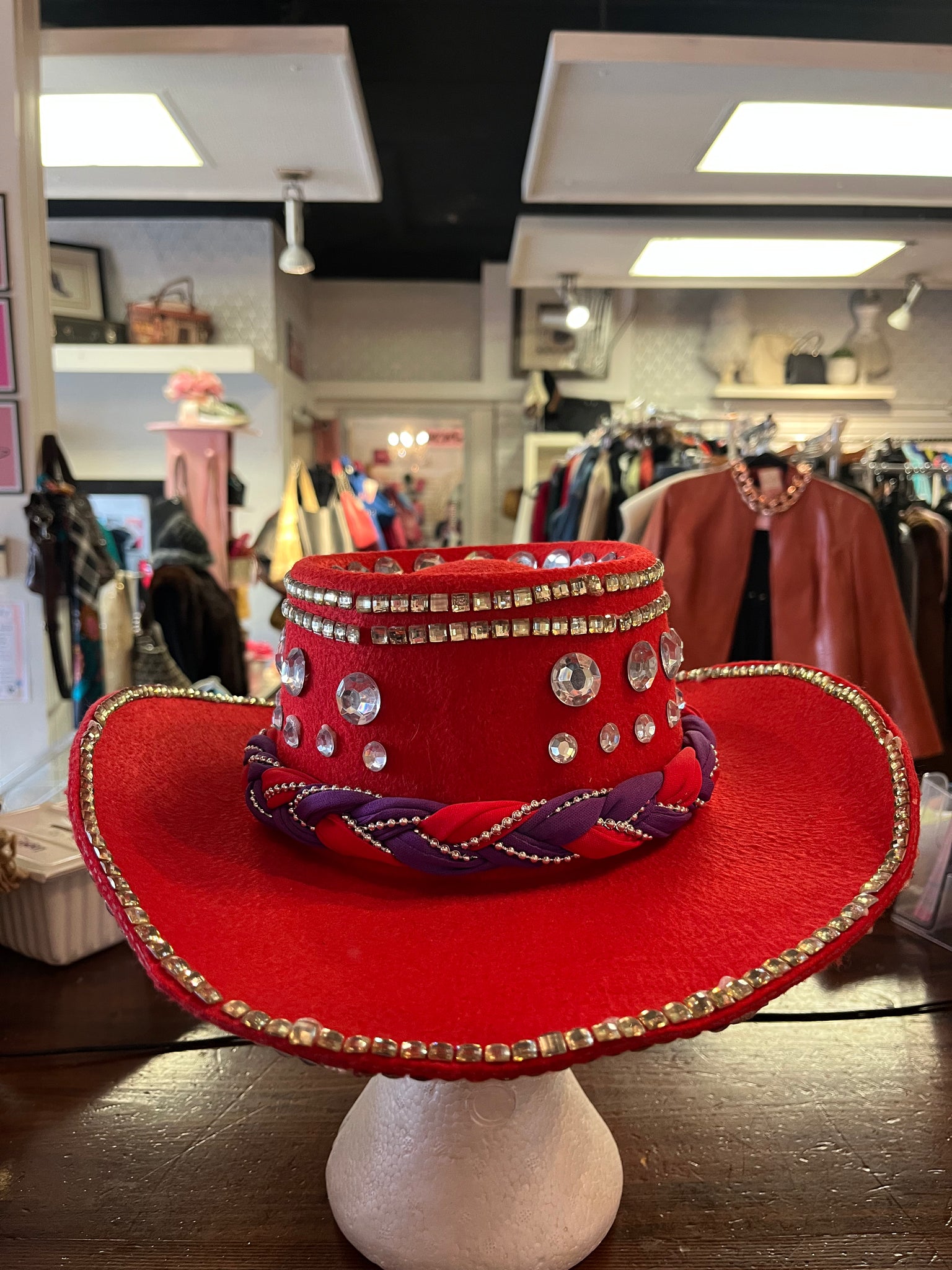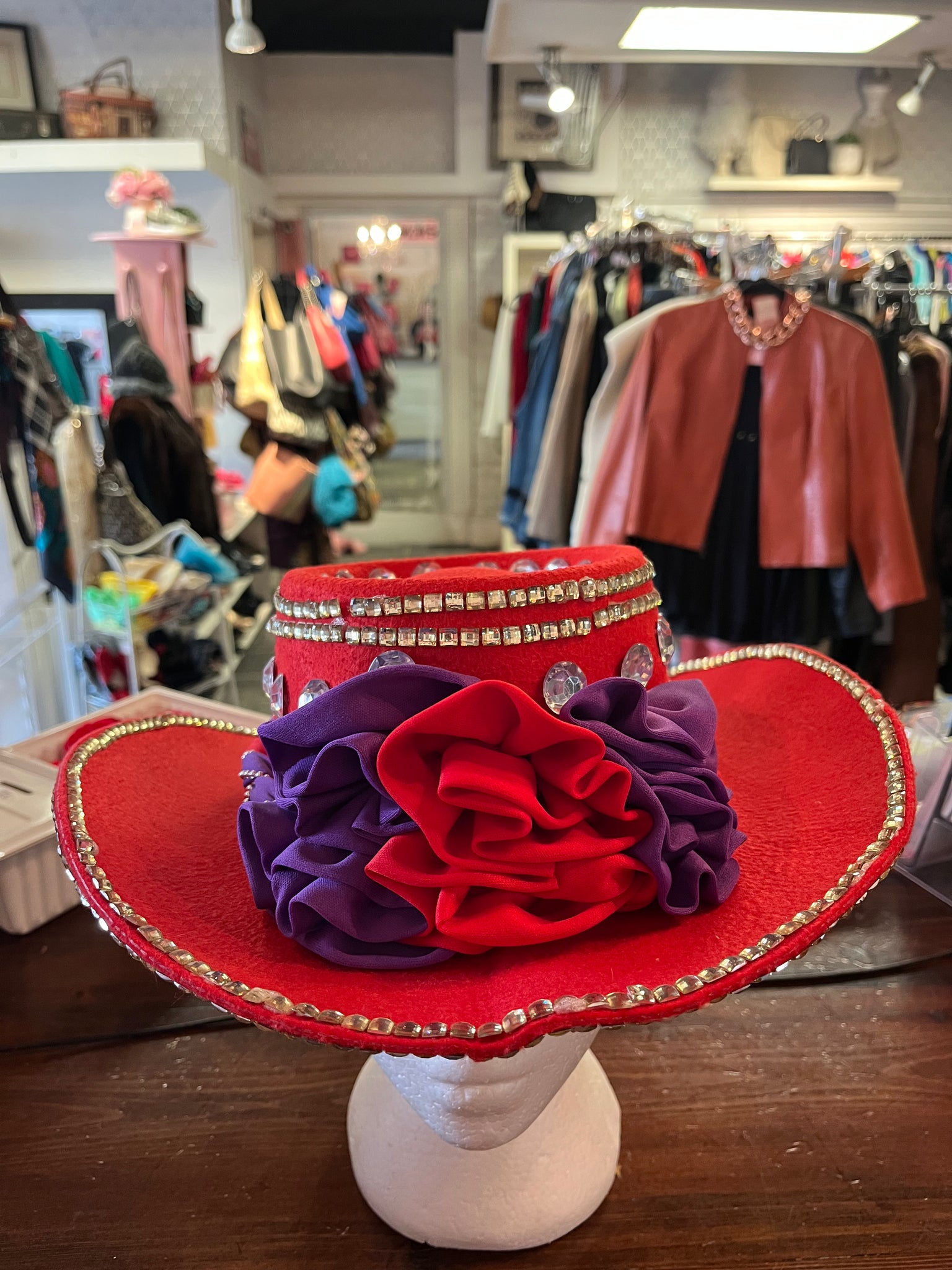 Make a bold statement with our *AS IS* Bedazzled Red Felt Hat! Crafted from soft felt, this hat is bursting with personality and sparkle. Adorned with dazzling rhinestones and a cluster of fabric rosettes at the front, it's perfect for themed parties, performances, or making a statement at any event. Don't be afraid to take a risk and stand out from the crowd!