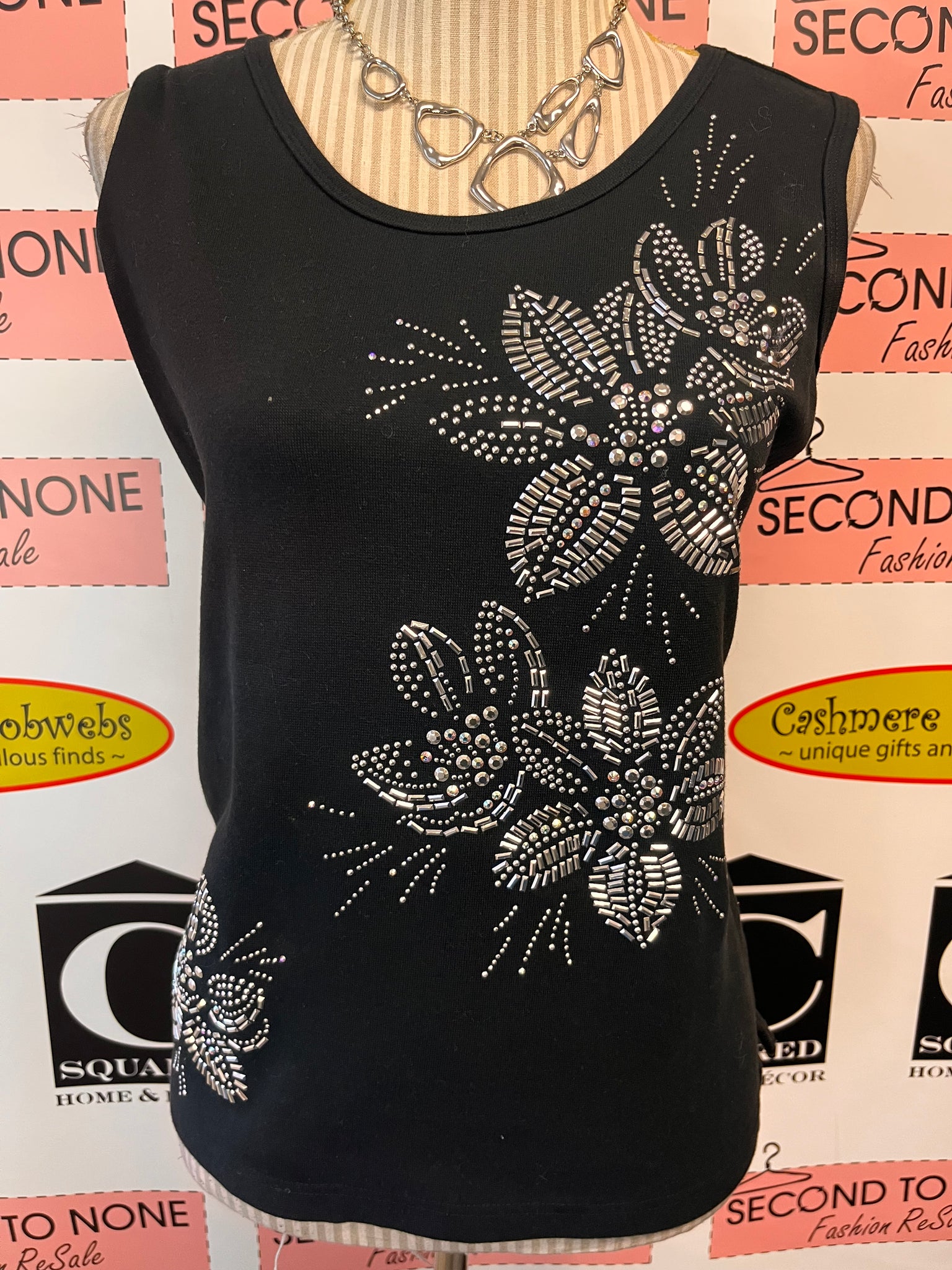 This black tank top is your new go-to for effortless style with serious sparkle. Crafted from a soft cotton and spandex blend, it features an elegant round neckline and wide shoulder straps that keep you comfortable all day long. The real magic? Intricate silver jewels arranged in delicate floral patterns that catch and shimmer with every movement, adding just the right amount of glamour to your everyday look. Thoughtful side slits prevent bunching while creating a flattering silhouette. Wear it solo for a statement piece or layer it under an open shirt for versatile styling that works from day to night. Size S.
