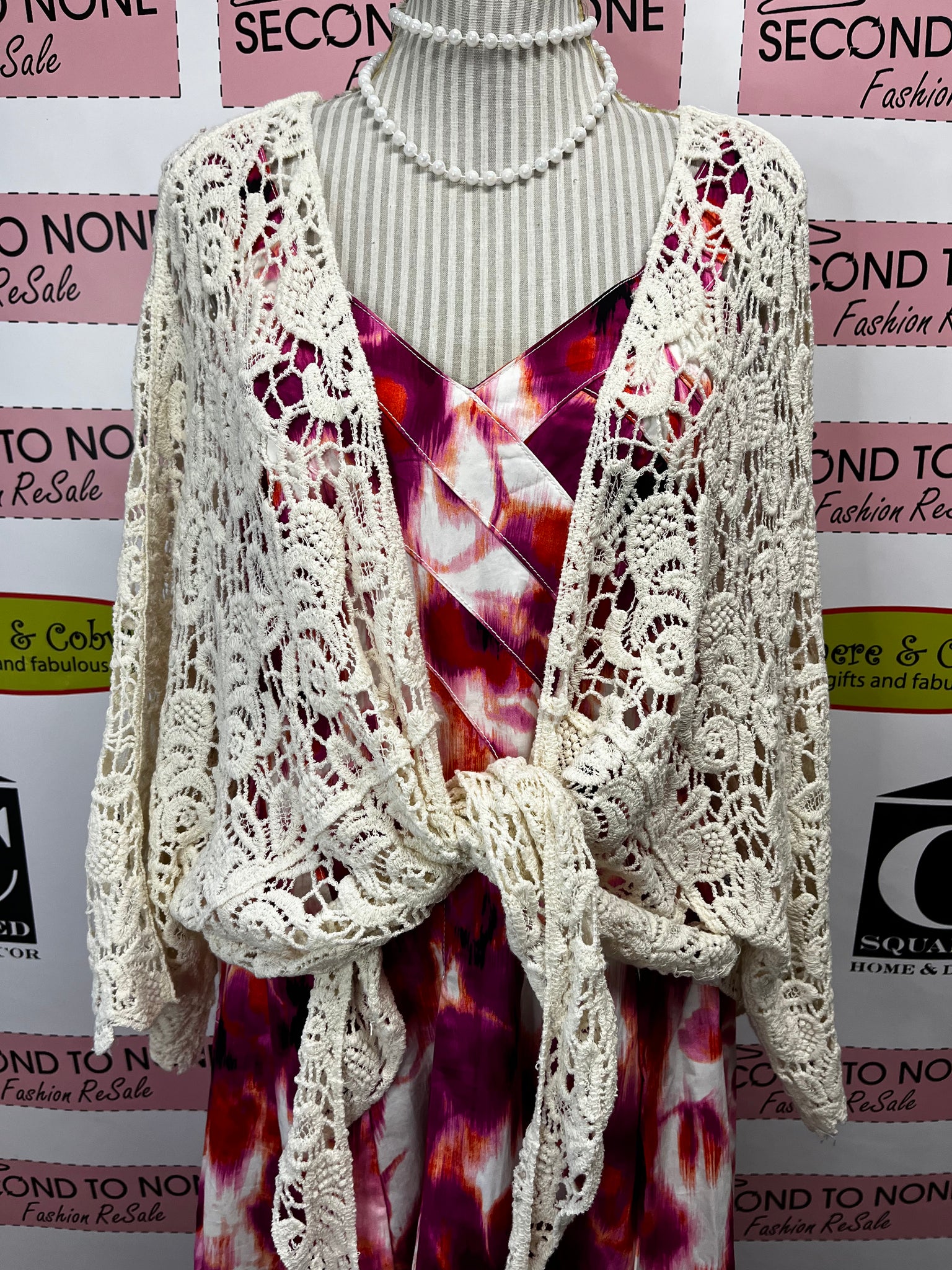 Layer up with effortless charm in this cream crochet shawl! The adorable tie-front detail adds a flirty touch, while the airy openwork keeps things breezy and breathable. Perfect for throwing over your favorite tee or dress, this one-size-fits-most beauty adapts to your vibe—whether you're going cozy-casual or dressed-up chic. Lightweight, versatile, and undeniably cute, it's the cover-up that does the heavy lifting on style.
