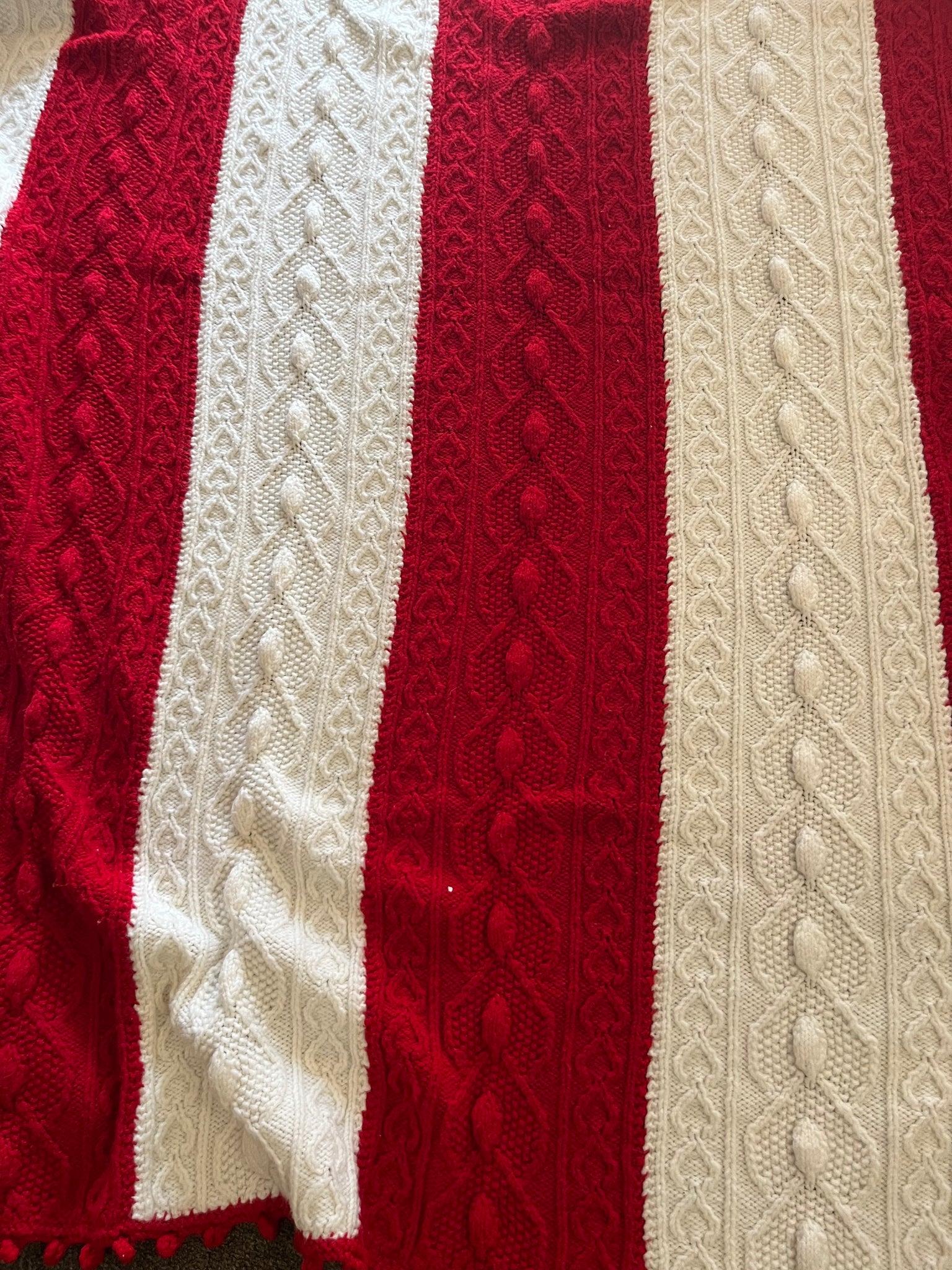 Wrap yourself in timeless elegance with this hand-knit cable blanket, featuring striking red and white stripes that work beautifully with any décor style. The classic fisherman knit texture brings cozy sophistication to your space, whether you're channeling modern minimalism or embracing traditional charm. Perfect for draping over a sofa, layering on your bed, or adding that festive touch to your holiday setup. This isn't just a blanket—it's a conversation starter that proves comfort and style go hand in hand. Measures approximately 5' square.