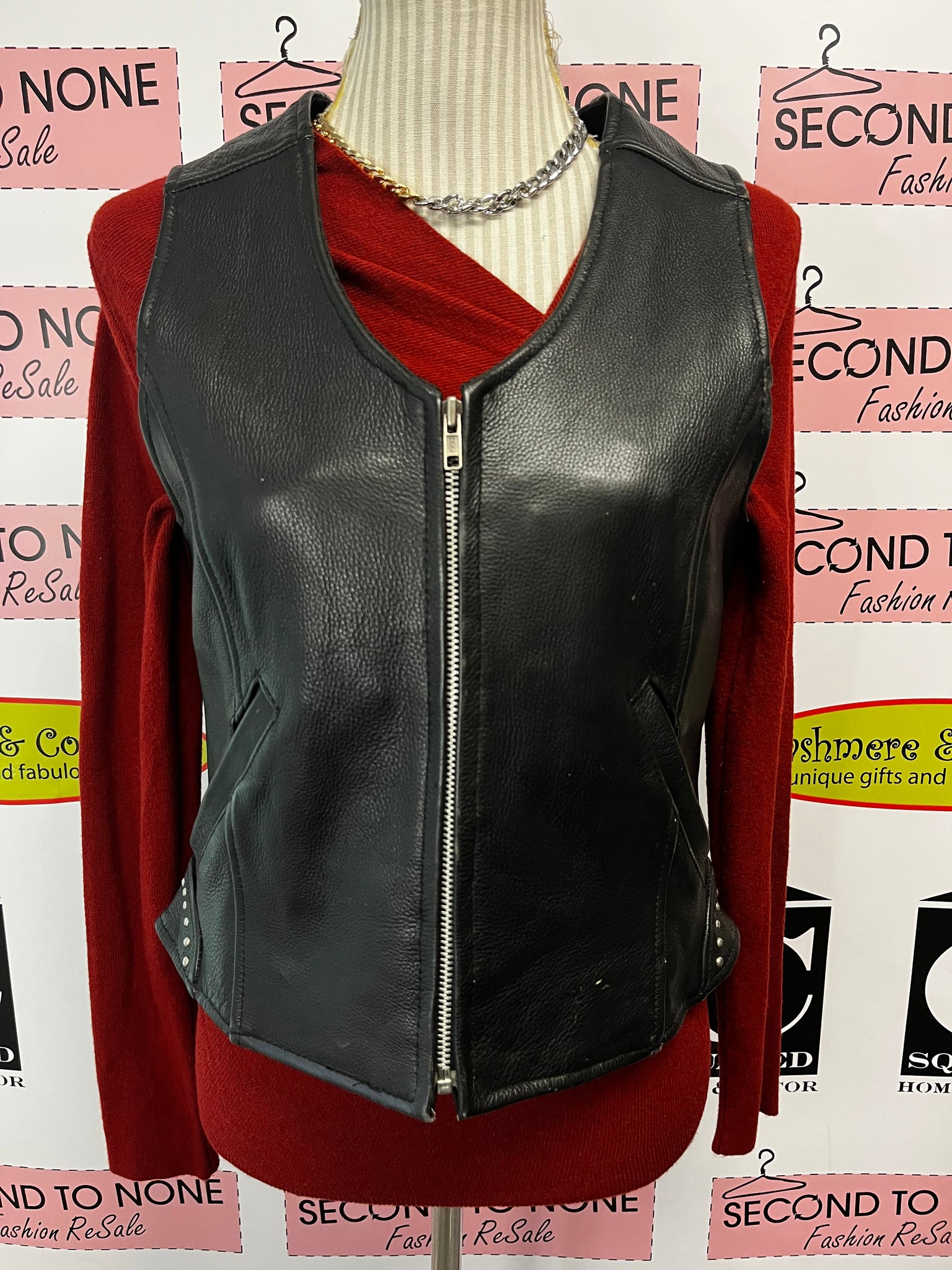 Rock that edgy vibe with this classic black leather biker vest from DN International. Featuring a bold zip front, studded details that catch the light, and a flattering rounded neckline, it's the perfect layer for adding attitude to any outfit. Practical front pockets keep your essentials close while you're out making a statement. Timeless style with just the right amount of rebel spirit.