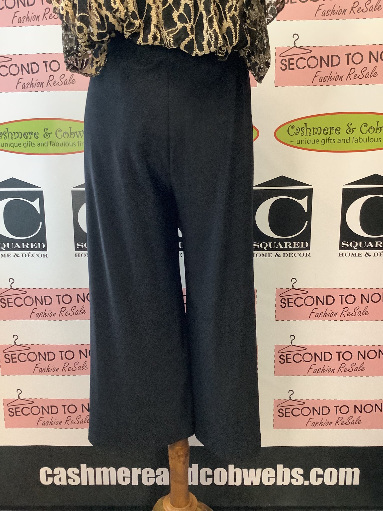 Effortlessly chic and undeniably versatile, these black palazzo pants feature a comfortable elastic waistband and flattering pull-on design. The elegant silhouette drapes beautifully with side slit details at the legs, creating movement and dimension. Perfect for dressing up with heels or down with chunky boots, these pants transition seamlessly from casual to formal occasions. The stretchy fabric ensures all-day comfort without compromising on style, making them an essential addition to any sophisticated wardrobe.