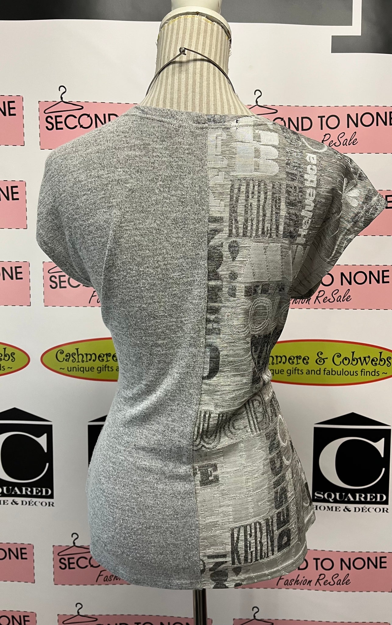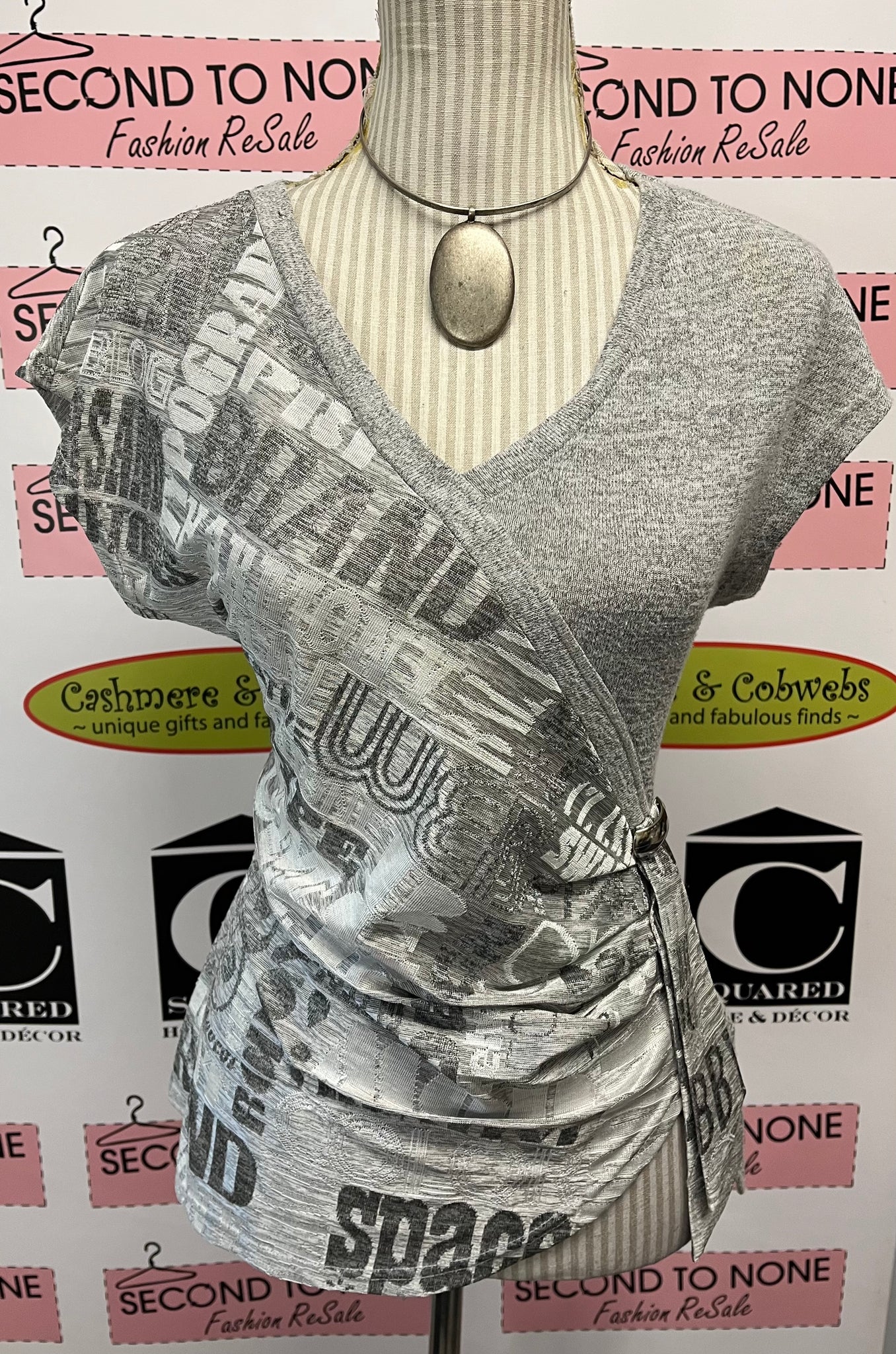 Elevate your casual wardrobe with this chic Ness tee that's anything but basic. The soft grey-silver fabric drapes beautifully, while a bold word print adorns the side for understated edge. A faux tie detail secured with a silver buckle adds unexpected sophistication, while the V-neckline flatters and the side split hem keeps things modern and flowy. Perfect for layering or wearing solo, this piece strikes that sweet spot between effortless and intentional.