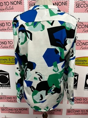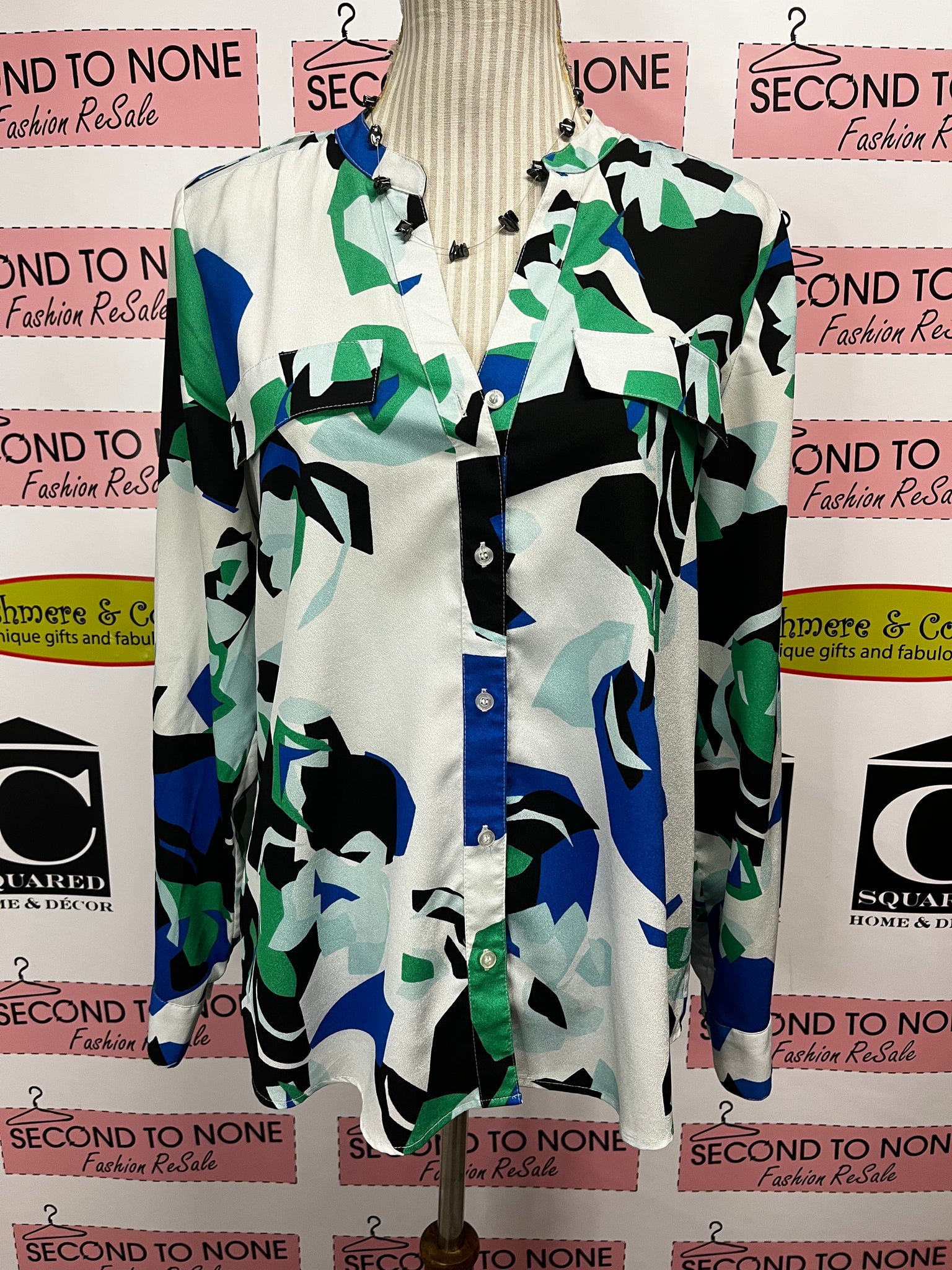 Elevate your casual wardrobe with this Calvin Klein button-front top, where bold abstract geometry meets everyday comfort. The striking mix of white, blue, black, and green creates an eye-catching pattern that works as hard as you do—pair it with jeans for effortless style or layer it over a tee for extra flair. Crafted from lightweight fabric, it's your new go-to for looking put-together without feeling weighed down. A timeless piece from a designer who gets it.