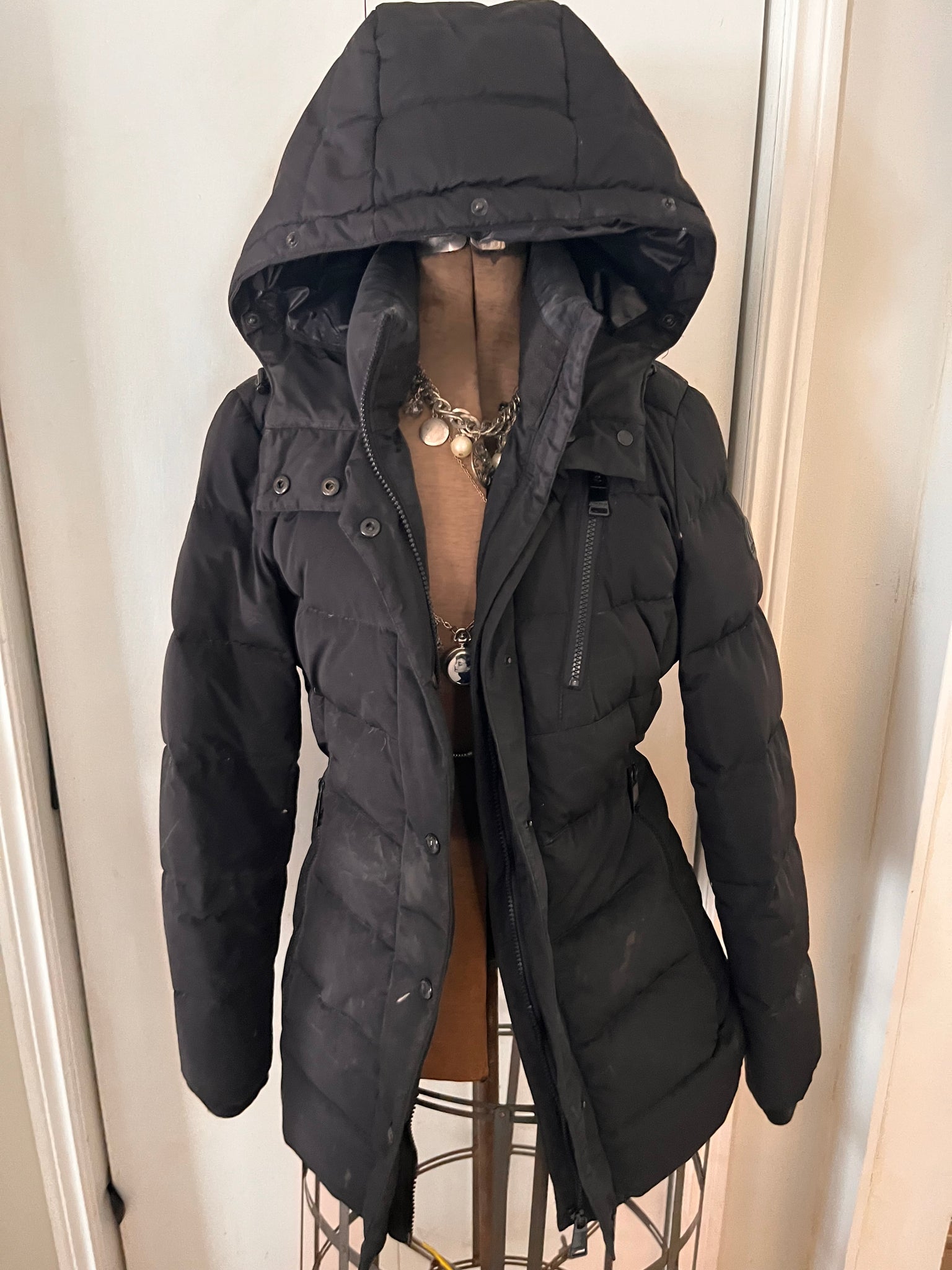 Stay cozy and chic in this stunning Calvin Klein Performance duck down-filled puffer jacket. The sleek black silhouette features a removable faux fur collar that snaps on for instant glamour, plus a cozy hood and fleece-lined neck warmer for those brutal Canadian winters. Storm cuffs seal out the cold, while multiple pockets—inside and out—keep your essentials close. Impeccably maintained and ready to elevate your outerwear game. 100% polyester. Duck-down fill.
