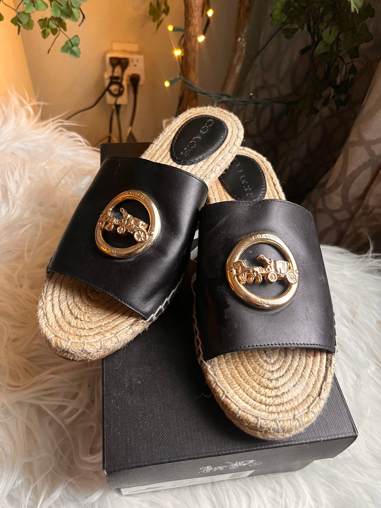 These Coach espadrilles blend timeless style with everyday comfort. The signature gold-tone logo anchors the sleek black leather band, while the woven straw insole keeps your feet happy through long days of wear. Flat construction means no breaking-in period—just slip them on and go. Practically pristine with original packaging included, they're ready to become your go-to pair for effortless sophistication.