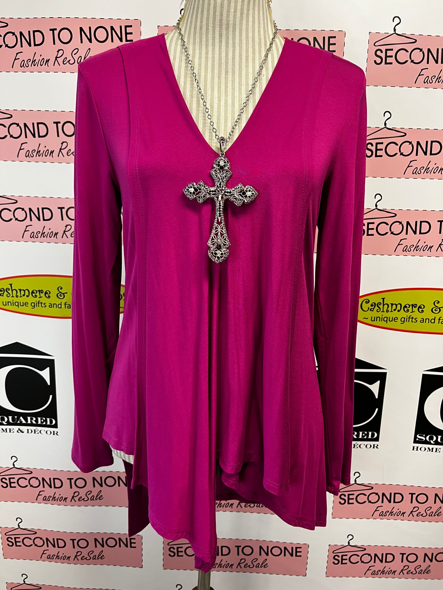 Get ready to tunic and roll! This Bali brand Fuchsia V-Neck Hi-Low Tunic (Size XS) is like a party for your wardrobe—long sleeves to keep your arms cozy and a bib front for that stylishly casual vibe. Perfect for twirling through life, or just lounging with a latte!