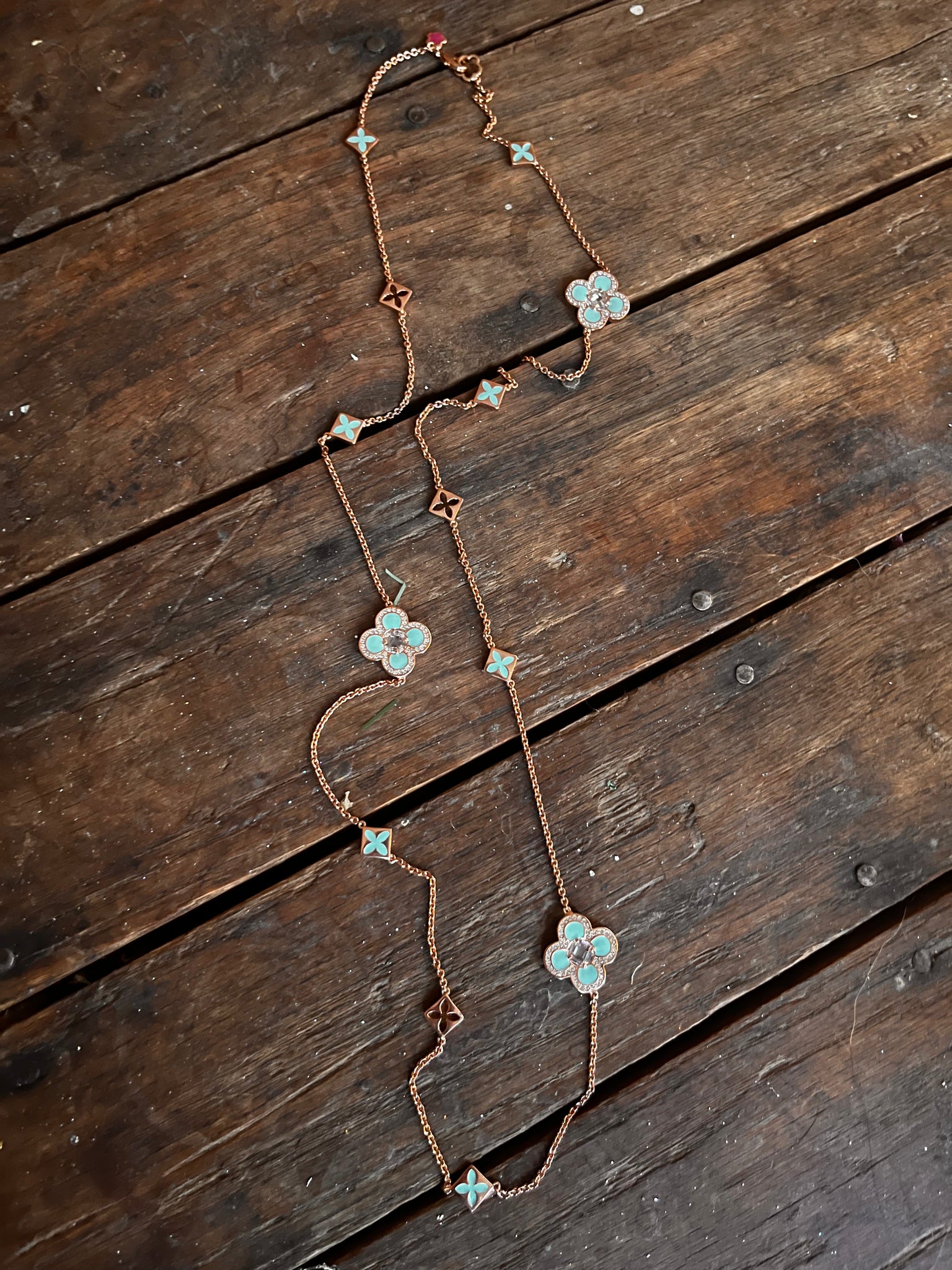 Elevate your style with the Lauren G Adams Turquoise Clover Necklace. With a length of 40 inches, this rose gold-plated accessory can be worn long for a bold statement or wrapped twice for a layered look. The bedazzled clovers add a touch of glamour to the intricate design, secured with a standard lobster-clasp for effortless elegance.