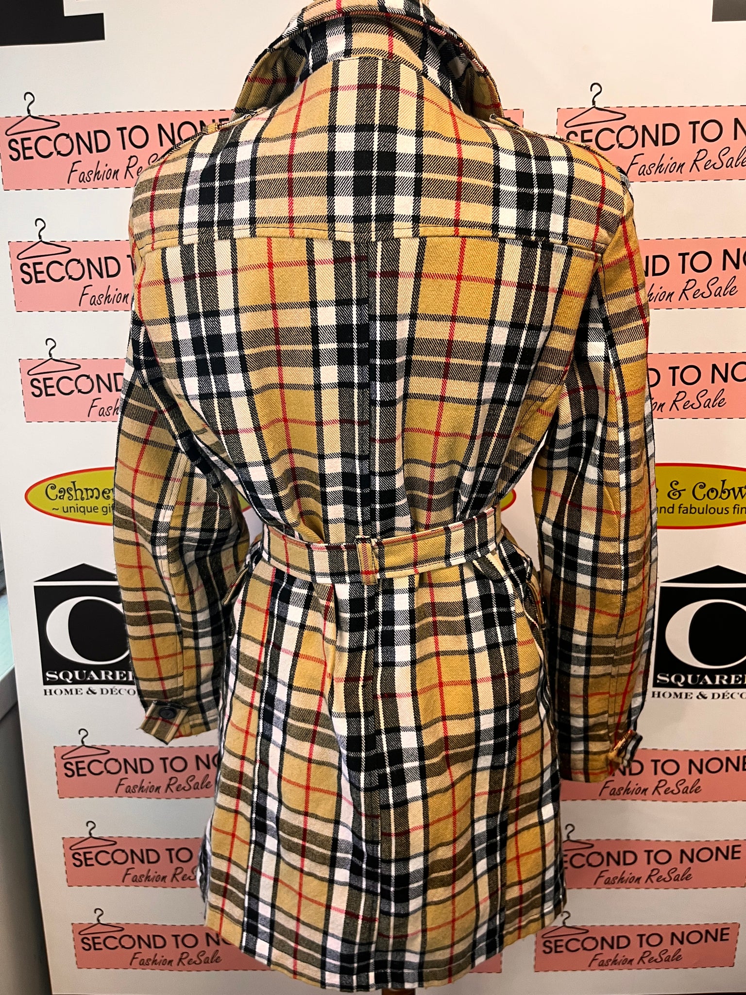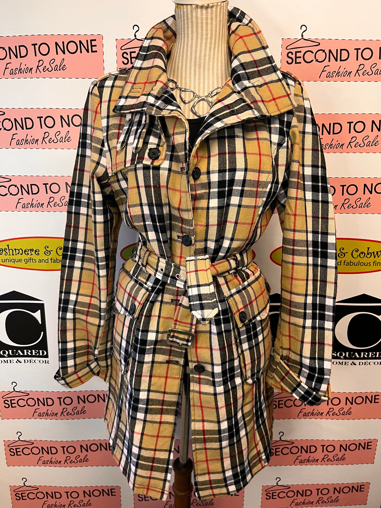 This classic trench jacket gets a spirited twist with its bold Scottish plaid in beige, white, black, and red. Featuring a belted waistline cinched with a sleek silver buckle and crisp black buttons, it's designed for versatility—wear it open to layer-stack in style or button up for polished sophistication. The timeless silhouette hits mid-thigh, offering that coveted long hemline that works with everything from dresses to denim. Finished off with a hidden interior pocket, this jacket is perfect for anyone who refuses to choose between timeless and playful. Size L but fits smaller.
