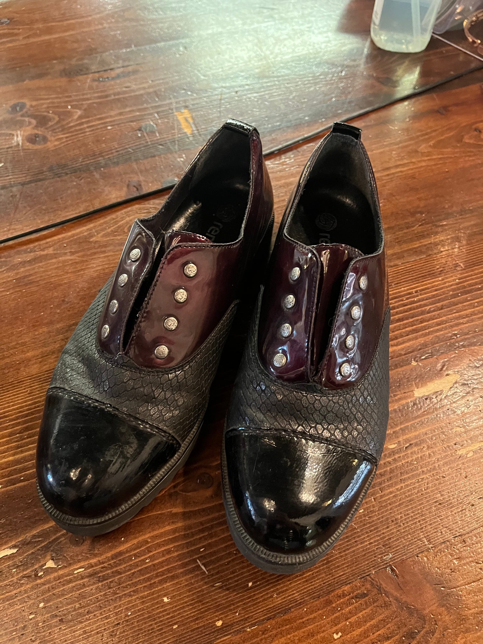 Step up your style game with Remonte's leather dress shoe. This sleek slip on features a textured snakeskin pattern in black, grey, and burgundy, plus studded detailing for a touch of edge. Perfect for any occasion, get ready to stand out in style. (Size 6/EU 37)