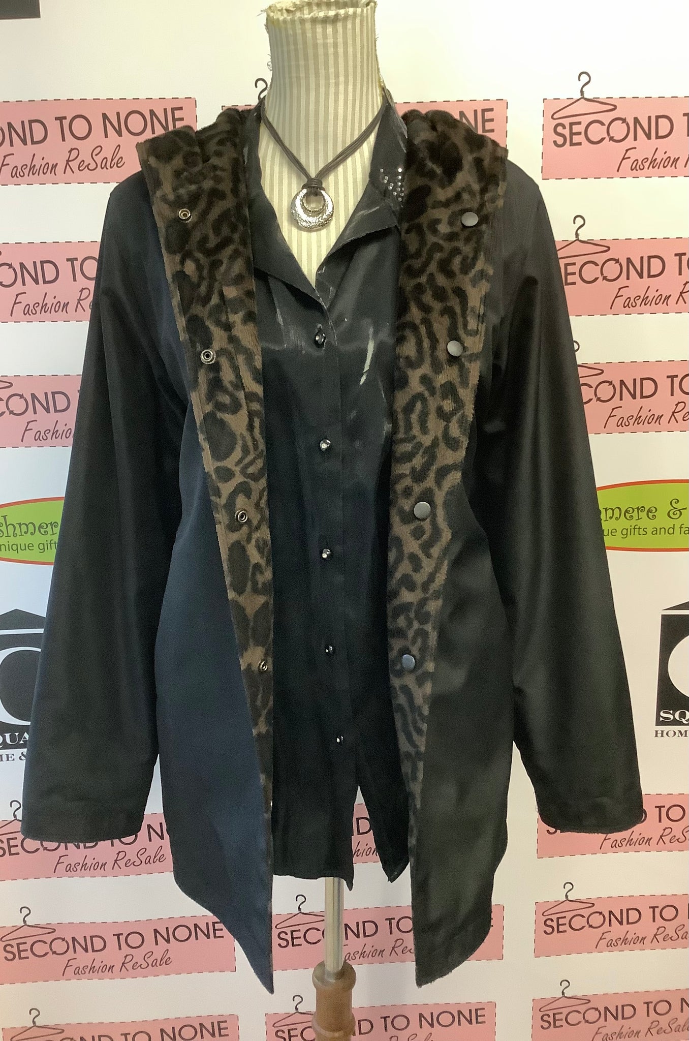 Elevate your outerwear collection with this sophisticated reversible coat that seamlessly transitions between two distinct aesthetics. One side features a sleek black finish, while the other showcases a luxurious fuzzy leopard print—giving you two versatile styles in a single piece. Weather-resistant fabric and a protective hood keep you comfortable through unpredictable conditions, while snap buttons and zippered pockets combine practicality with polished design. Perfect for urban exploration, this fashion-forward coat pairs beautifully with tailored gloves and a refined handbag for effortless city elegance.