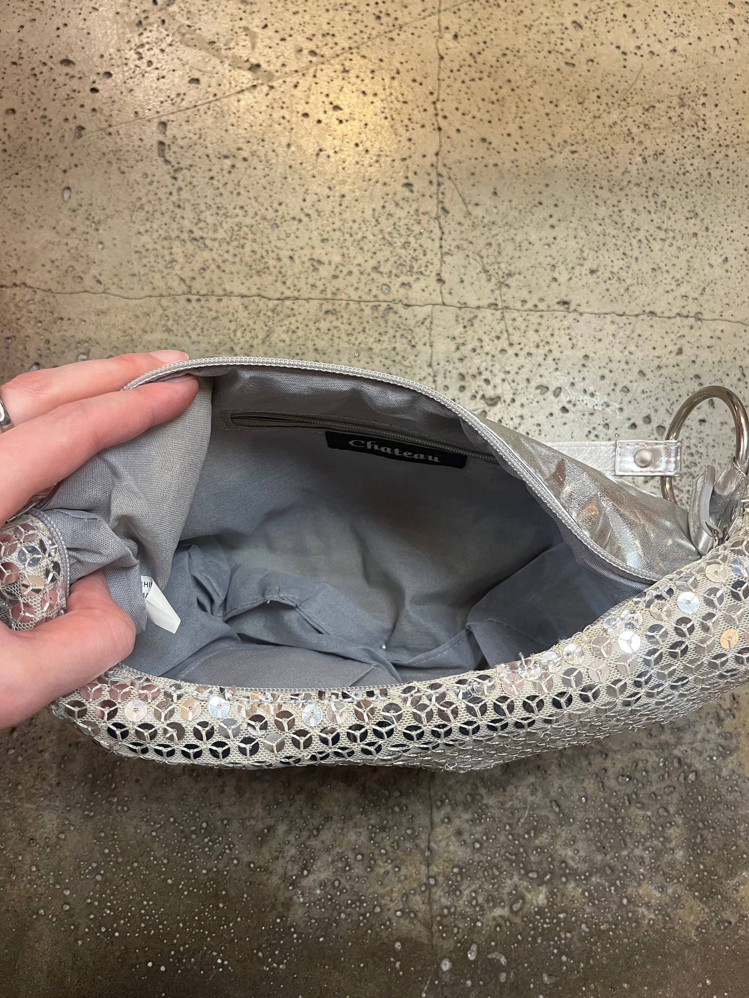 Elevate your holiday look with this dazzling Silver Sequin Shoulder Bag—a playful essential that brings instant glamour to any outfit. Oversized silver hoop details frame the sides while sequins catch the light, keeping you shimmering throughout the day. The spacious main compartment holds everything you need, whether you're heading to a festive party or casual brunch. Dress it up for evening events or down for everyday wear. Best of all, it folds compactly for travel, so you can take your sparkle anywhere. A versatile statement piece that transforms any ensemble into something special. Brand: Chateau.