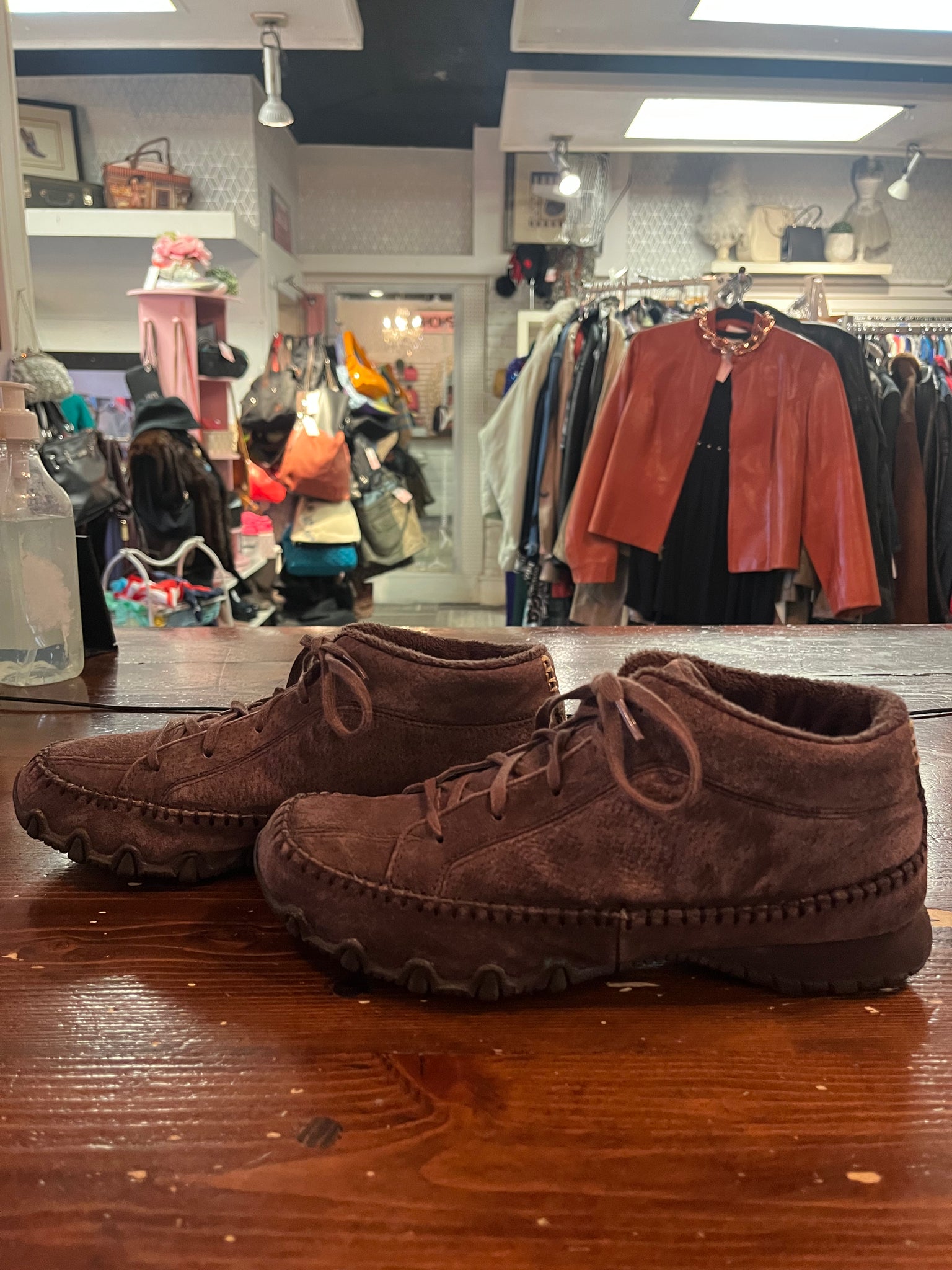 Experience the ultimate comfort and style with our Skechers Suede Moccasin Shoes in Chocolate Brown. Featuring a super soft suede upper and faux fur lining, these shoes are perfect for any adventure. The durable tread and memory foam sole provide long-lasting wearability, while the moccasin style stitching adds a touch of unique design. Get the best of both worlds with a fusion of hiking booties and moccasin in one shoe. Size 8.5.