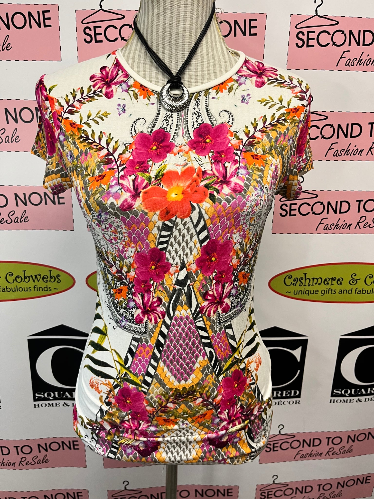 Stay stylish and comfy in this designer Ted Baker (London) Floral T-Shirt, designed with a stretchy, fitted cut that hugs your silhouette. The bold, beautiful floral print pops vividly against a crisp white front and back, making every outfit effortlessly eye-catching. Perfect for adding a playful flourish to your casual wardrobe with flair. 96% viscose/4% elastane
