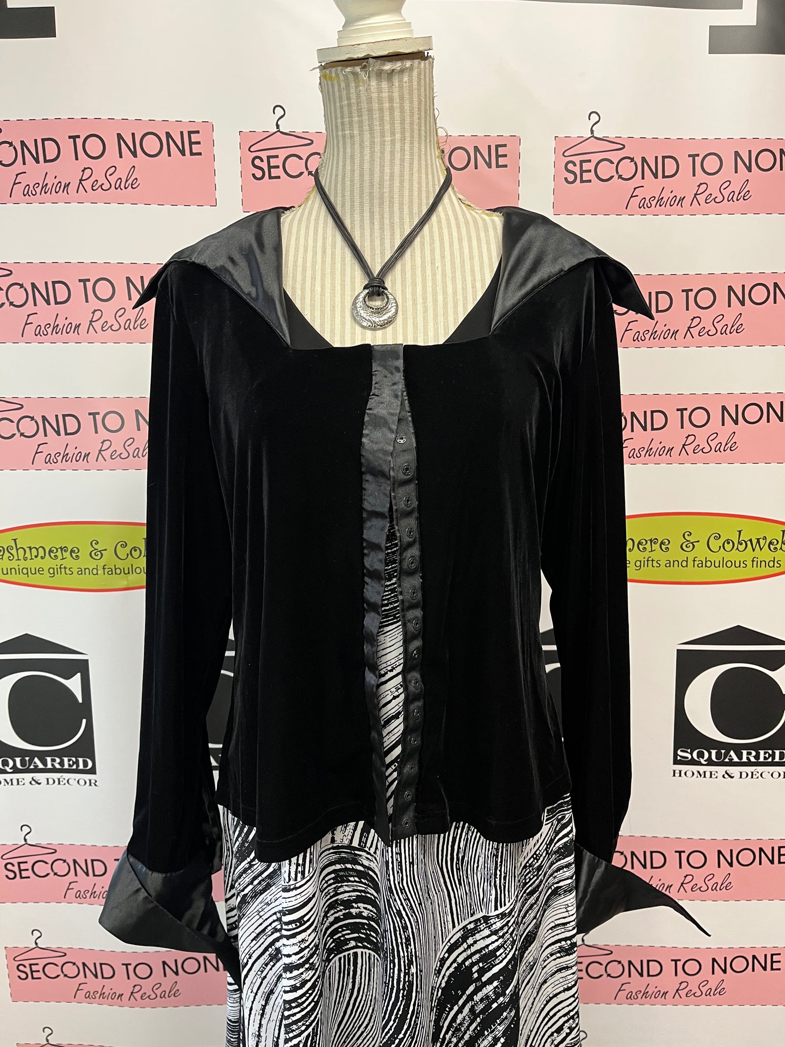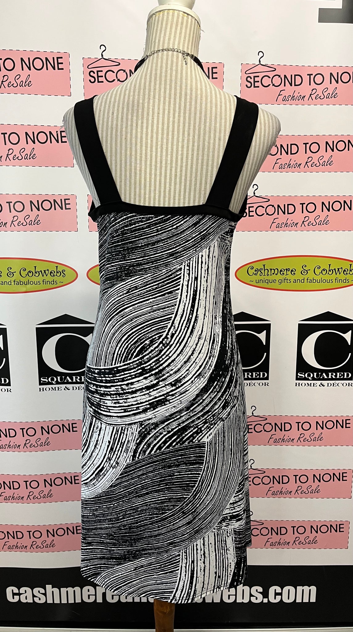 Unleash your inner fashion maven with the Vintage B&W Sundress. This stunning piece from Gitane features a playful black and white abstract print, a flattering v-neckline, and a knee-length hemline. Perfect for a sunny day out, this sleeveless sundress is made in Canada and exudes effortless style. (Size L)