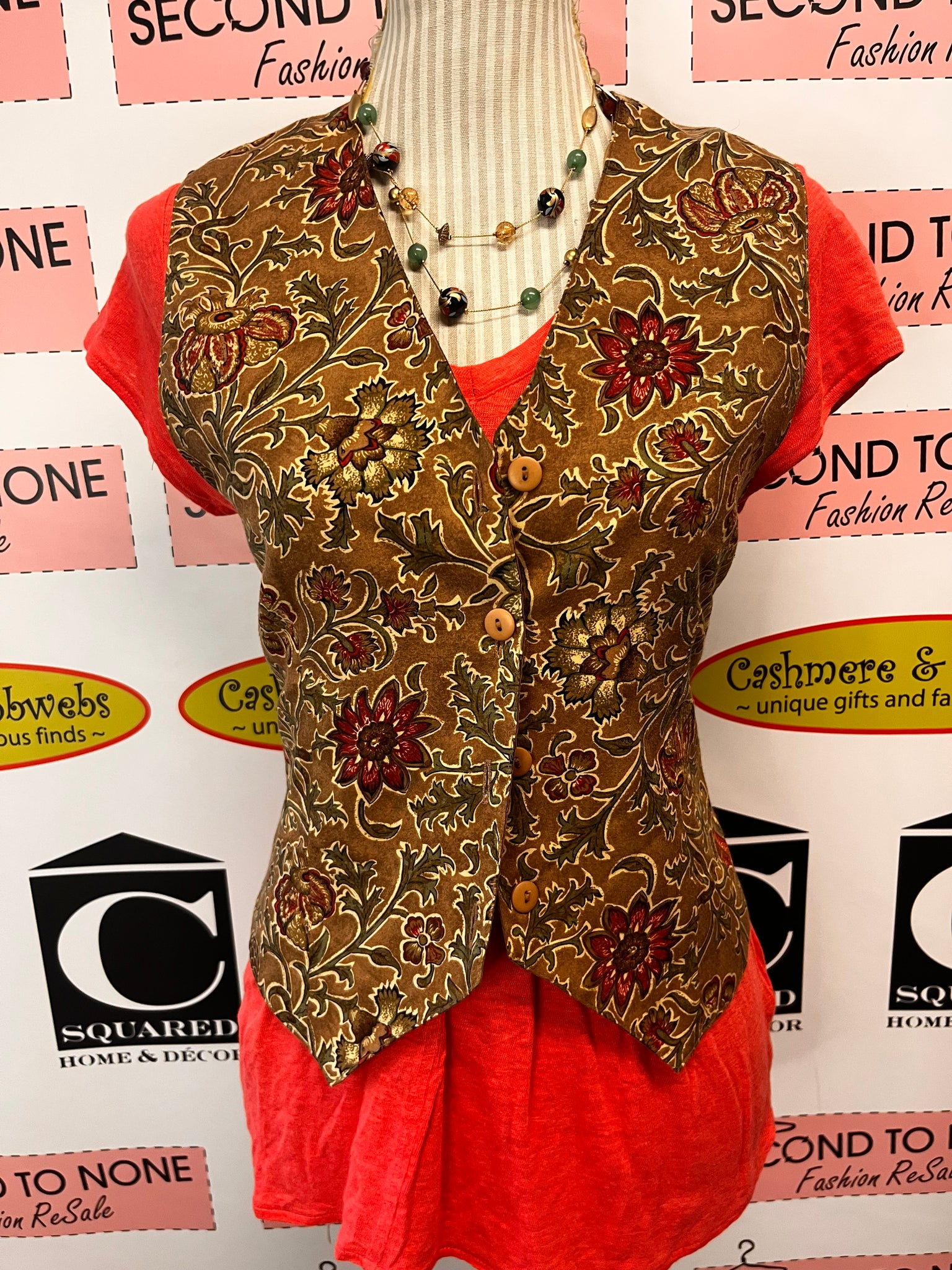 Effortlessly romantic, this vintage Cleo Petites vest channels cottage core charm with its delicate floral print in warm red, browns, creams, and olive tones. The slightly cropped silhouette and pointed hem create a flattering, vintage-inspired line, while the lightweight fabric makes layering a breeze over blouses, dresses, or fitted tees. V-neck styling and light brown button closure add understated elegance to any boho-leaning outfit. Perfect for those who love curated, one-of-a-kind pieces with character. Size S.