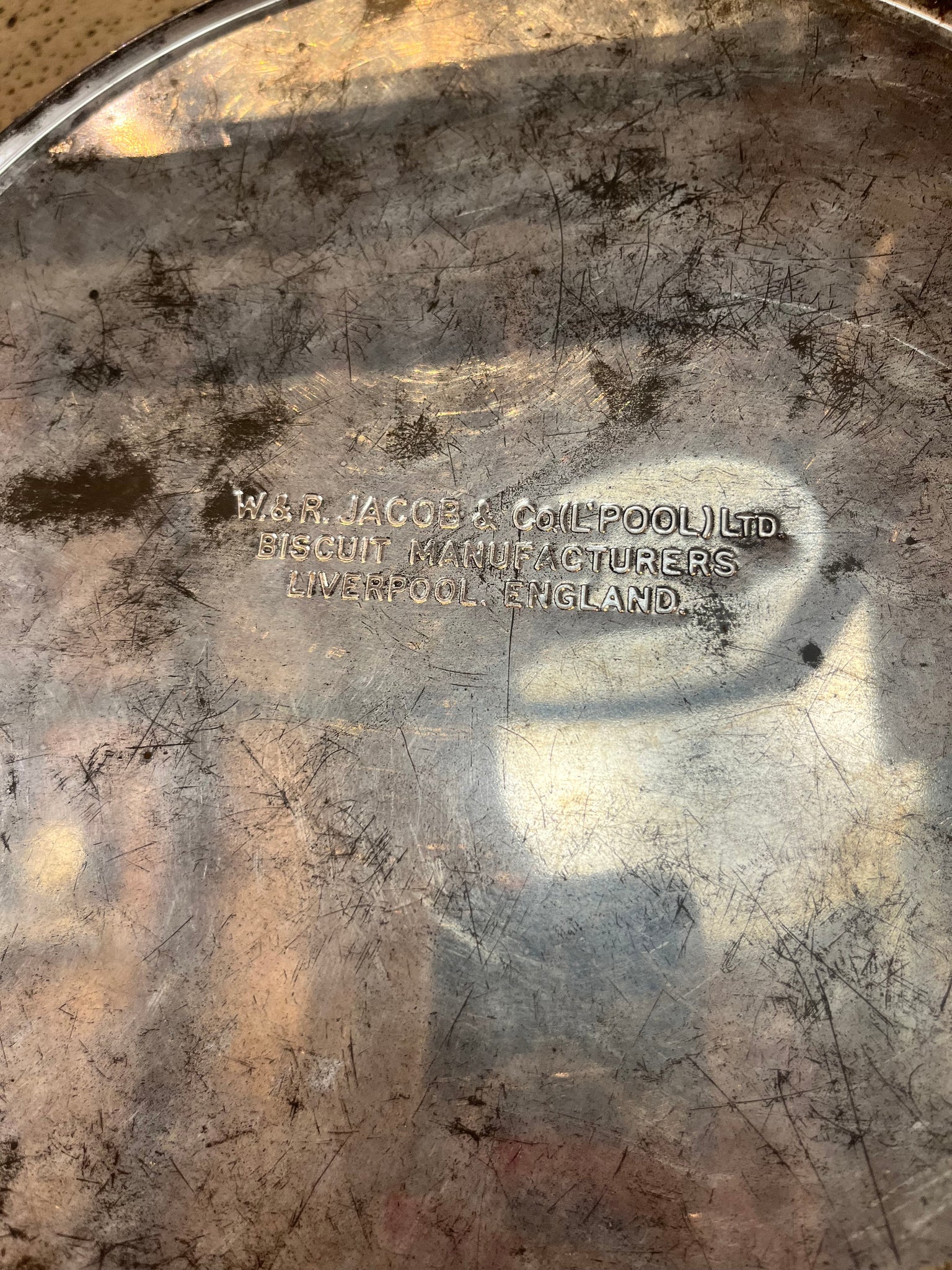 Add a splash of charm to your space with this Vintage Cookie Tin from Liverpool, England. Adorned with delightful flowers and vibrant colors, it’s perfect for storing your treasures or simply brightening up your table as a cheerful decoration. A playful way to keep memories sweet and your space stylish!  W & R Jacobs & Co. Measures 10" across.