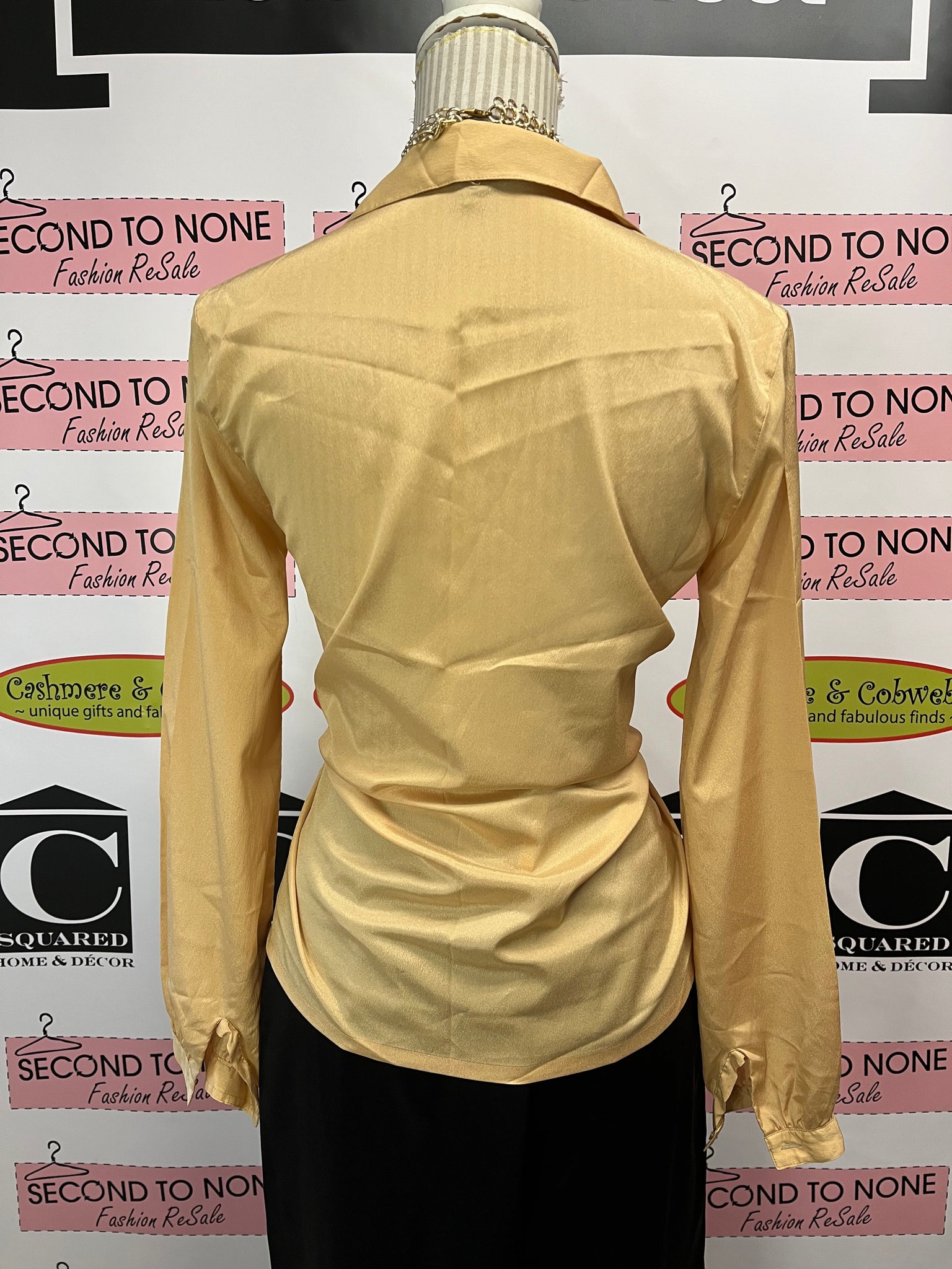 Discover the magic of vintage dressing with this stunning Irka Paris silk blouse in glowing golden hues. Double-breasted styling gives it serious sophistication, while those adorable petite buttons add a wink of personality. The soft collared neckline is pure comfort, and a handy breast pocket proves that vintage style doesn't skip the practical details. Slip this beauty on and watch heads turn—it's the kind of timeless piece that makes you feel like you've uncovered a secret treasure.
