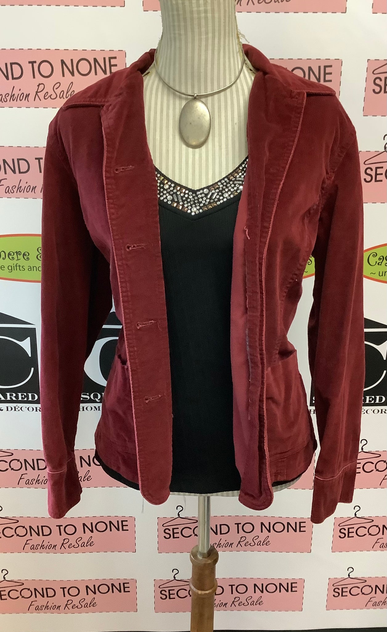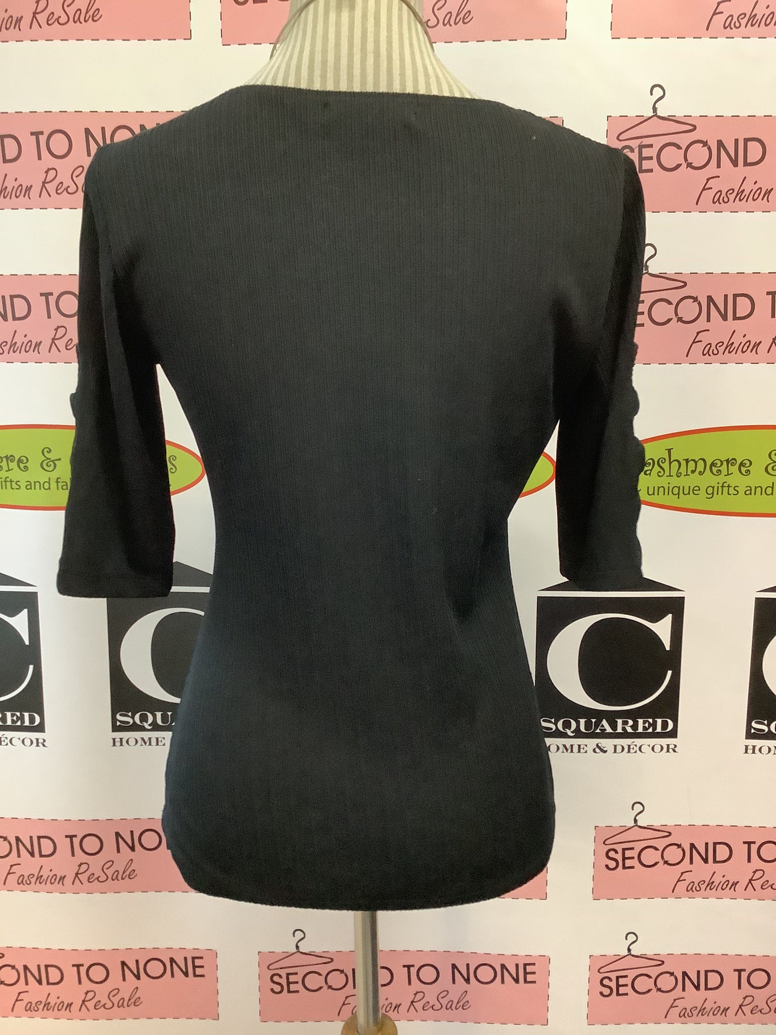 This elegant ribbed knit top features a striking deep V-neckline adorned with shimmering silver and rose gold faux gemstones that catch the light beautifully. The fitted silhouette showcases a luxurious black base with comfortable spandex stretch, while three-quarter sleeves provide a refined, modern touch. Perfect for layering under a tailored jacket or pairing with faux leather leggings for a polished New Year's Eve look. The gemstone embellishment elevates any ensemble, making this vintage-inspired piece an effortless choice for sophisticated evening styling.