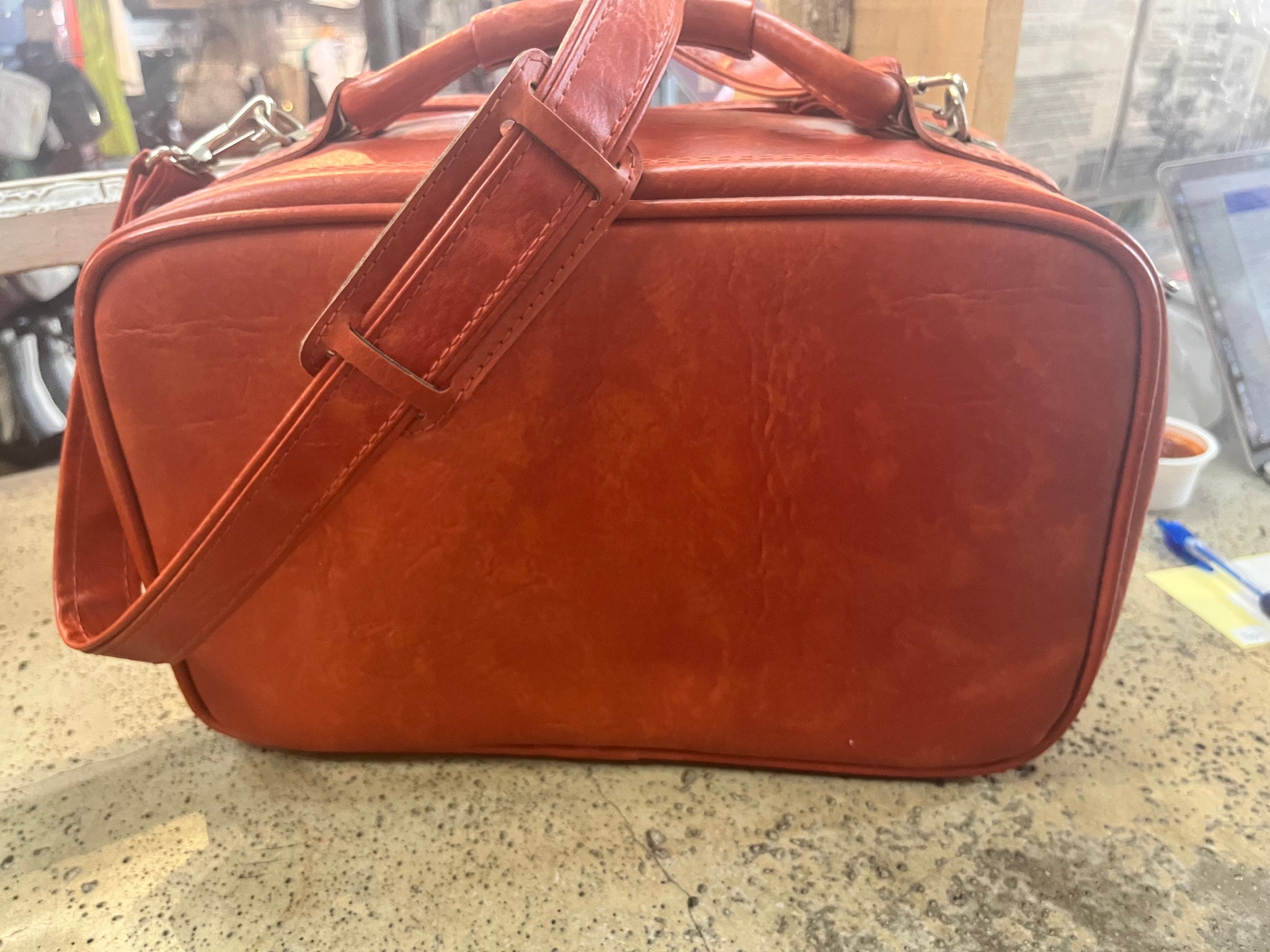This Vintage Samsonite Carry-On Suitcase is a vibrant burst of rich orange, ready to turn heads wherever you go. In mint condition, it features double-sided zippered compartments for clever packing and a handy shoulder strap for easy carrying. Plus, sturdy feet on the bottom keep it standing tall and proud. Travel in style with this playful, retro gem! Measures 16" across x 7" deep x 10" high.