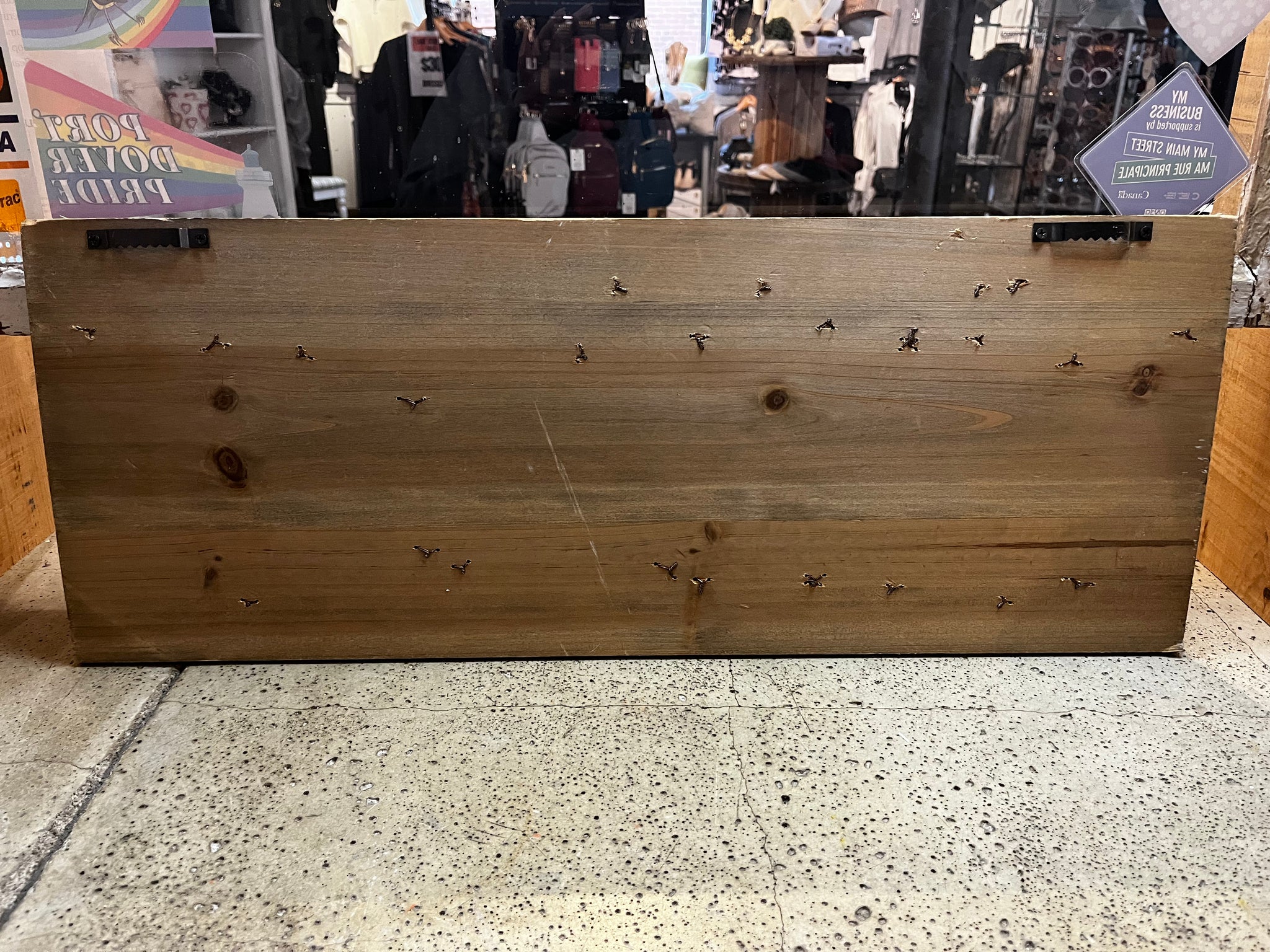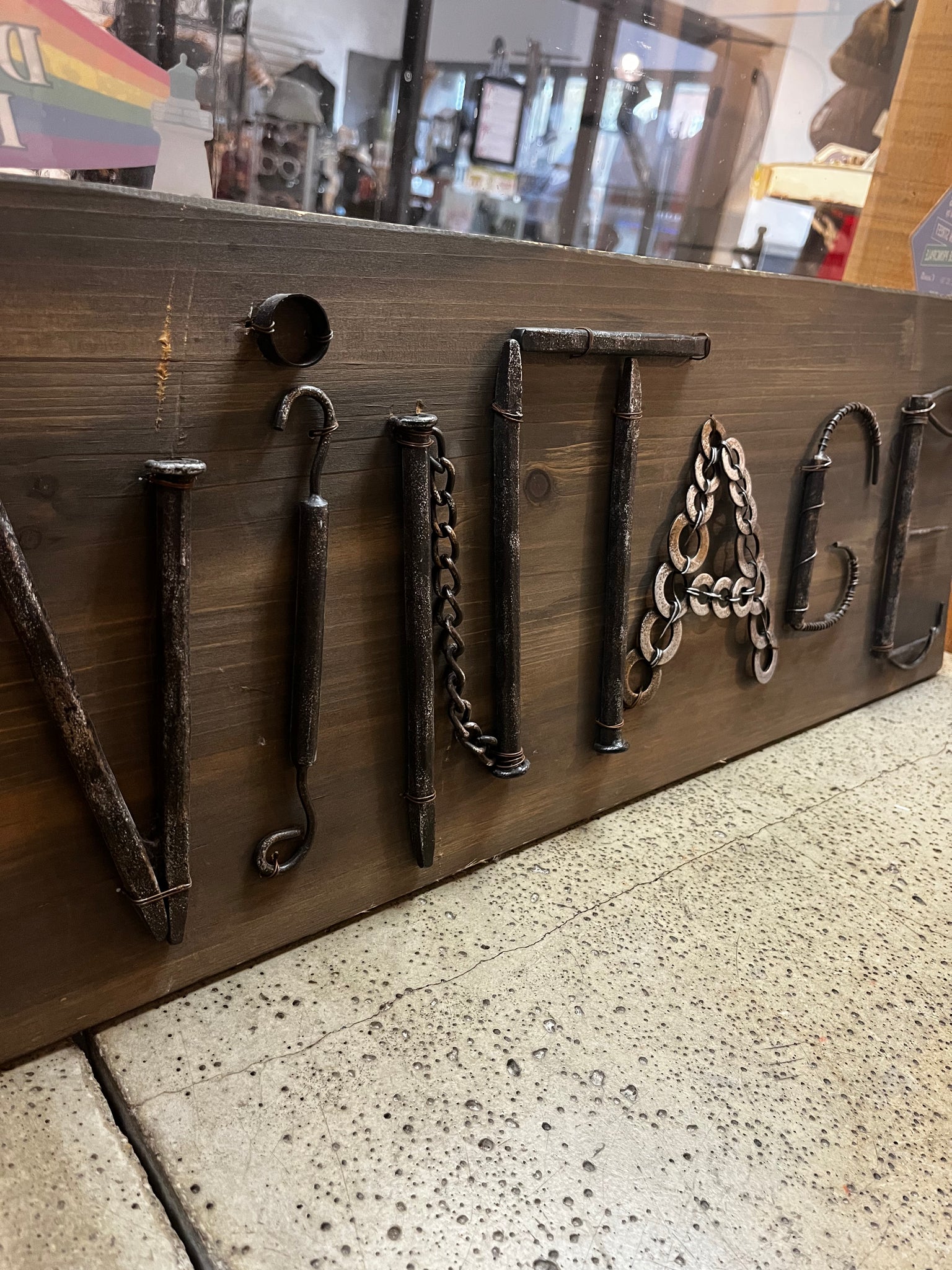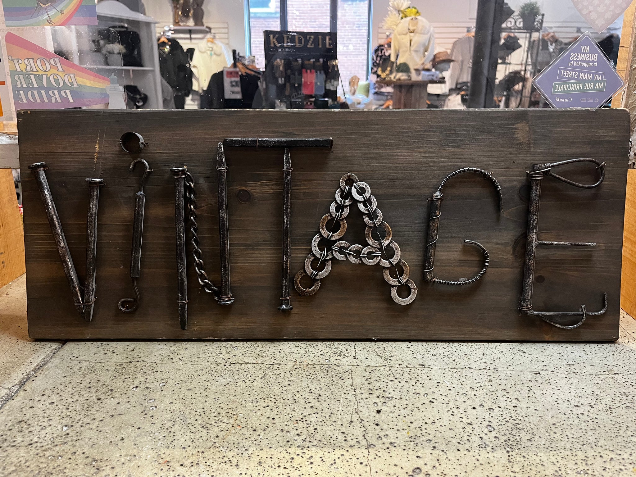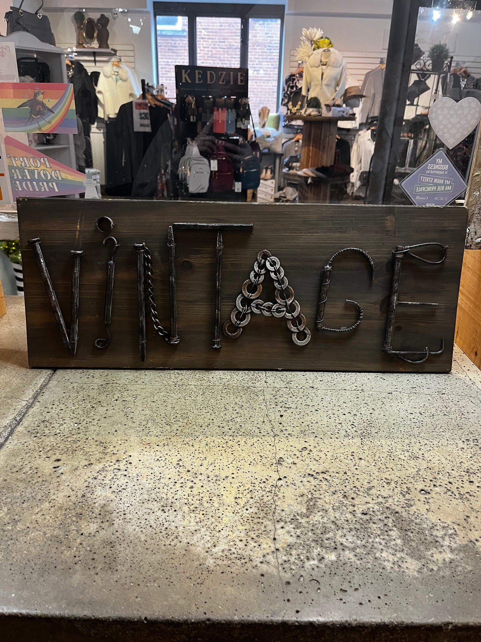 This striking wooden sign brings retro charm to any space with its bold "Vintage" lettering crafted from weathered scrap metal. The industrial aesthetic pairs perfectly with art deco design elements, creating a conversation-starting piece that celebrates nostalgia. Whether displayed in a loft, shop, or living room, this handcrafted sign adds character and vintage flair to your décor. A perfect blend of rustic appeal and modern edge.